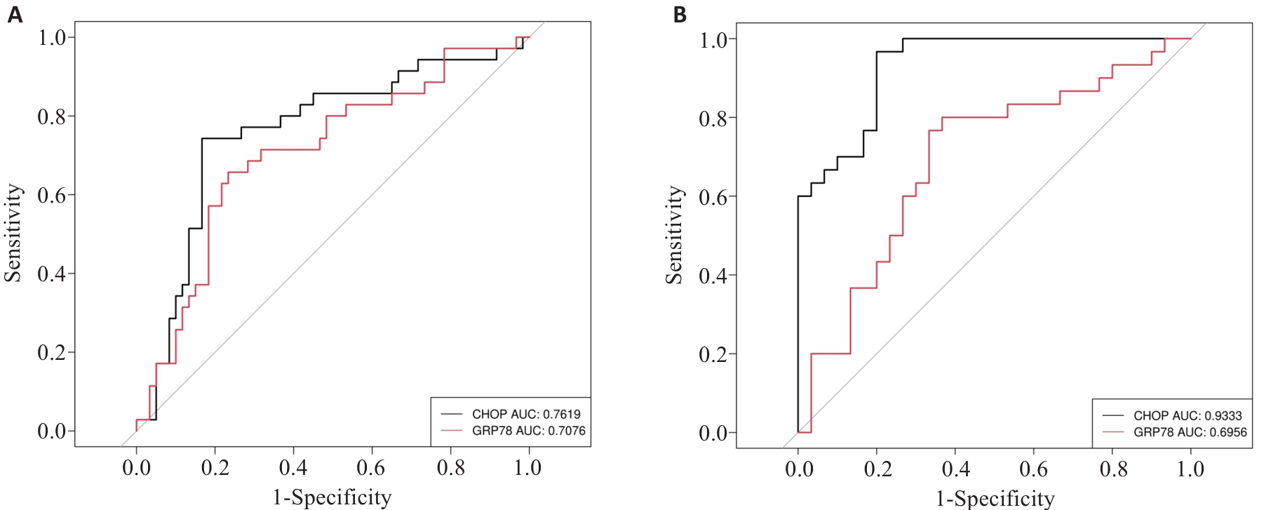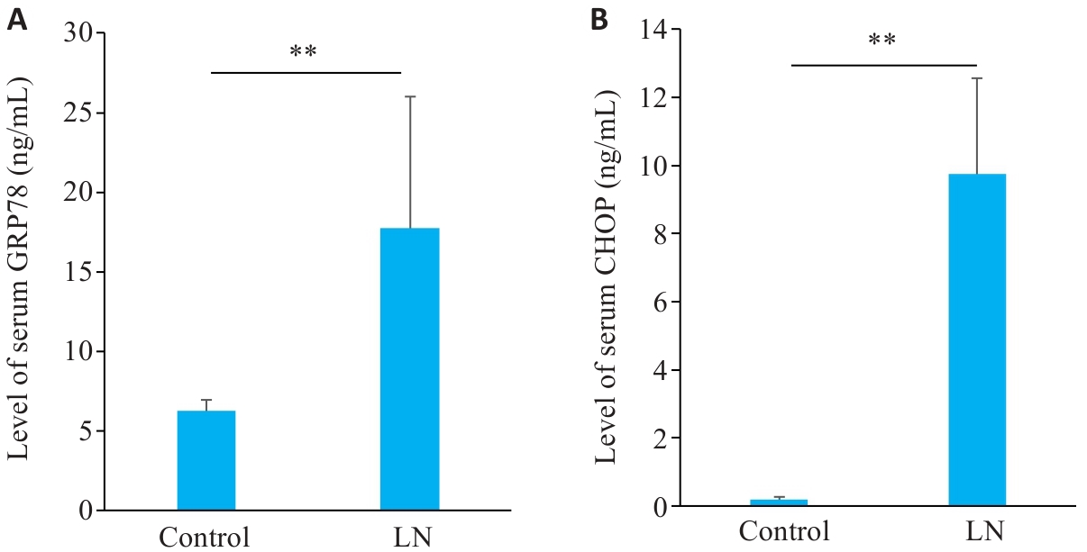 Objective To examine the changes in serum levels of endoplasmic reticulum stress (ERS) proteins GRP78/CHOP in patients with lupus nephritis (LN) and analyze their diagnostic value and association with renal pathological features. Methods From a sample bank established based on a multicenter cohort study of systemic lupus erythematosus (SLE), 60 LN patients and 35 SLE patients without renal involvement were randomly selected. ELISA was used to detect serum levels of GRP78 and CHOP in the patients to analyze their correlation with clinical features and their diagnostic ability for LN and active LN. MRL/lpr mice were used as an animal model of LN to examine their serum levels of GRP78 and CHOP expression and renal expressions of endoplasmic reticulum apoptosis-related proteins. Results Serum GRP78 and CHOP levels were significantly higher in LN patients than in SLE patients without renal involvement (P<0.05), and were also higher in active LN patients than in patients in the stable phase (P<0.05). Correlation analysis indicated that serum GRP78 and CHOP levels were positively correlated with SLEDAI scores and 24-h urinary protein. ROC analysis showed that CHOP had a high diagnostic ability for LN (AUC=0.762) and active LN (AUC=0.933). Consistent with the clinical findings, serum GRP78 and CHOP levels were elevated in LN mice, and the expressions of PERK and IRE1α pathway proteins were also increased in the kidneys of the mice. TUNEL staining showed increased renal cell apoptosis and elevated renal expressions of apoptosis-related proteins in LN mice. Conclusion Serum levels of GRP78/CHOP are increased in LN patients possibly in association with ERS-induced apoptosis mediated by the PERK/IRE1α dual pathway.