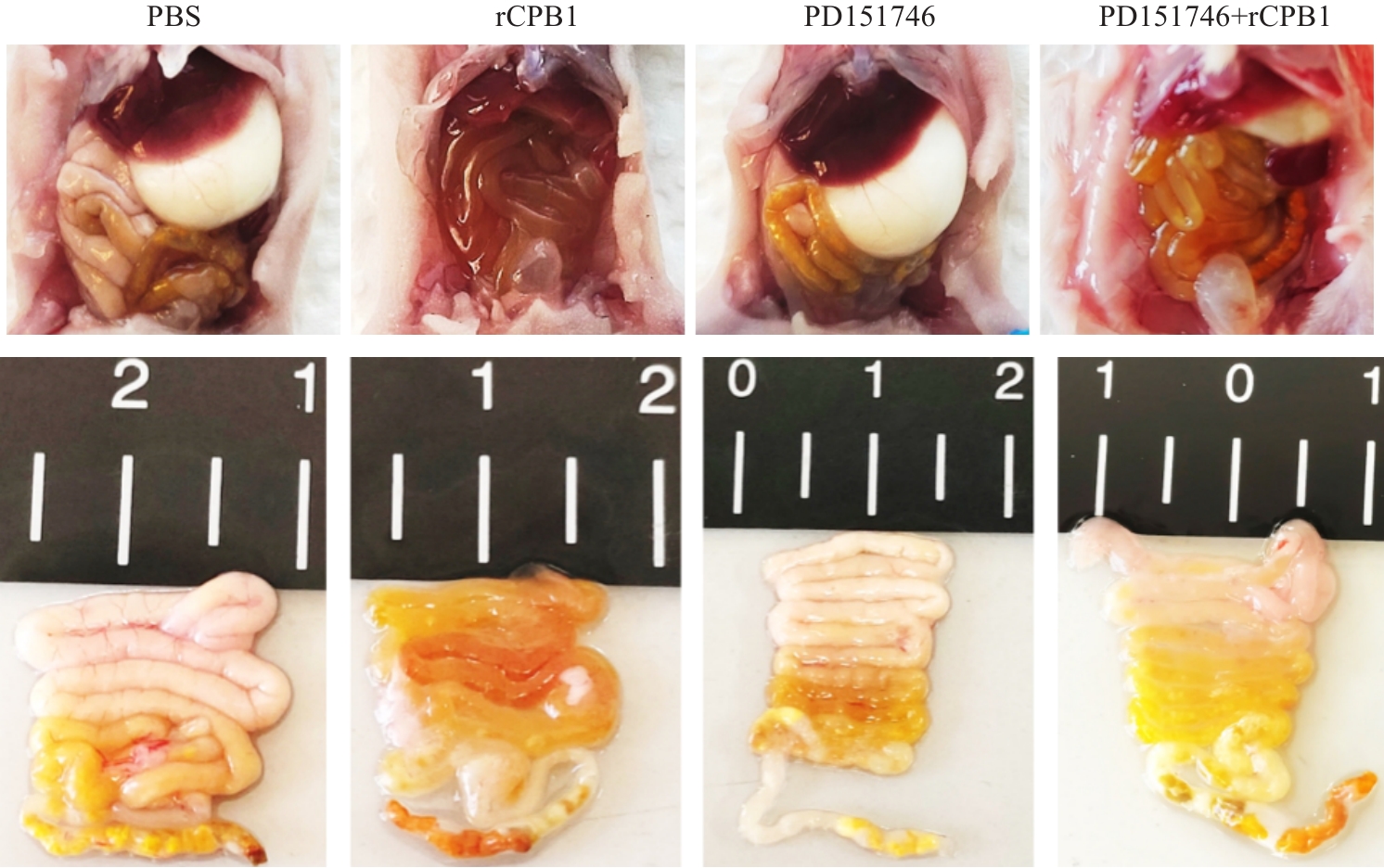 Tab.3 Differential expression of inflammatory factors in the jejunal tissue between PD151746 and Beta1 toxin co-treatment group and Beta1 toxin treatment group
