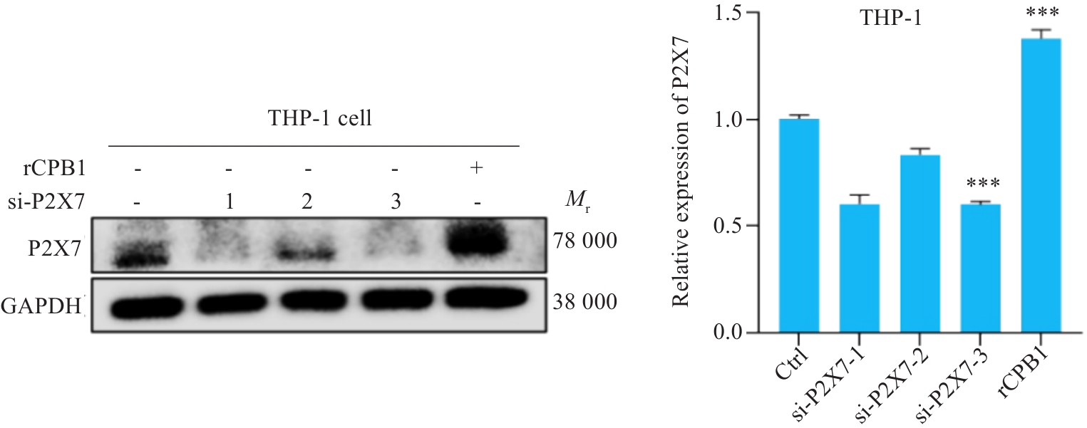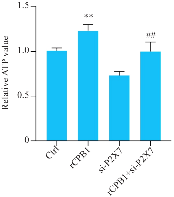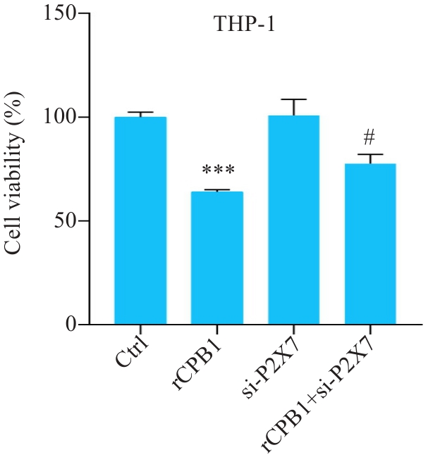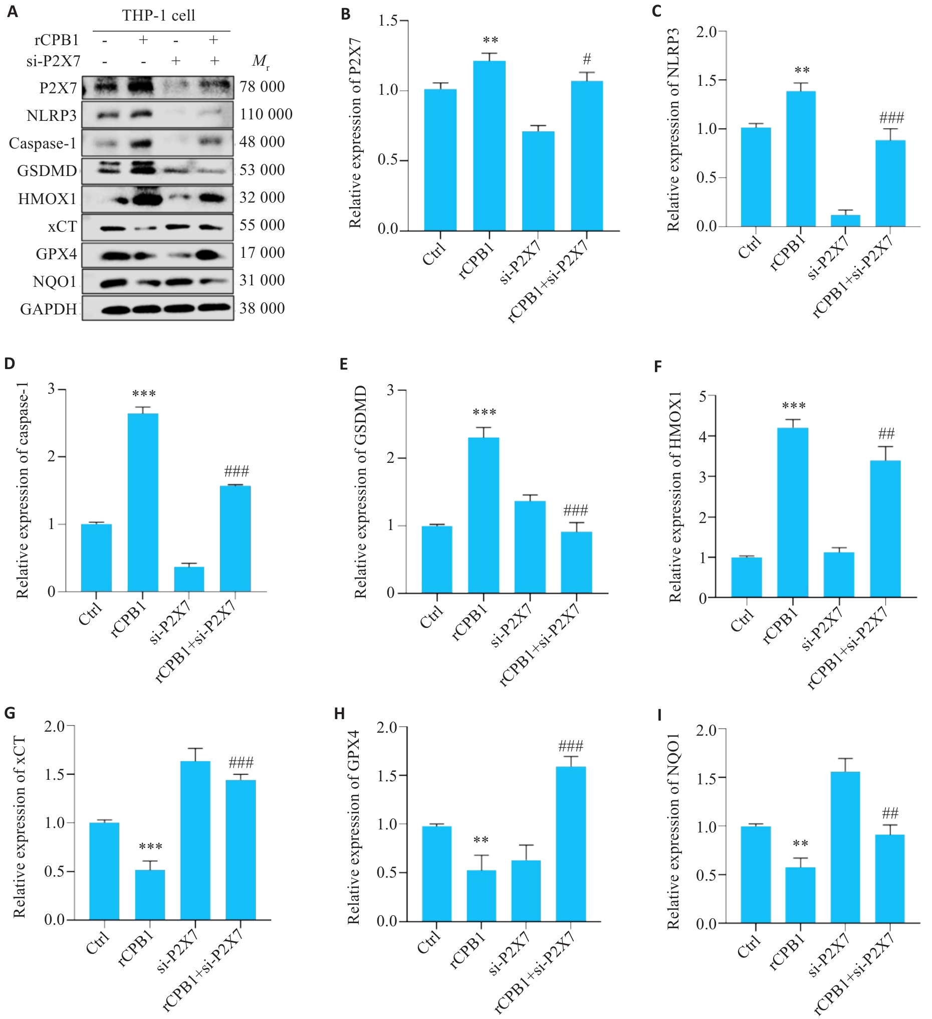 Fig.7 Expressions of pyroptosis- and ferroptosis-related proteins in THP-1 cells with rCPB1 treatments, P2X7 receptor knockdown, or both. **P<0.01, ***P<0.001 vs Ctrl; #P<0.05, ##P<0.01, ###P<0.001 vs rCPB1 (n=3).