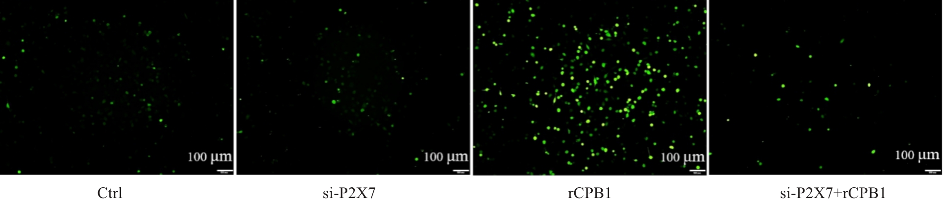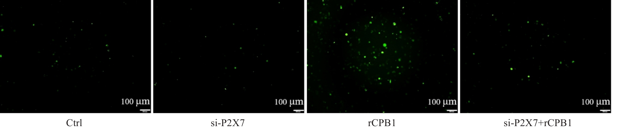 Fig.4 P2X7 receptor knockdown decreases Ca2+ levels in rCPB1-treated THP-1 cells. Negative Ca2+ signal is seen in Ctrl group and si-P2X7 group, and positive Ca2+ signal (green) is shown in rCPB1 group and si-P2X7+ rCPB1group.