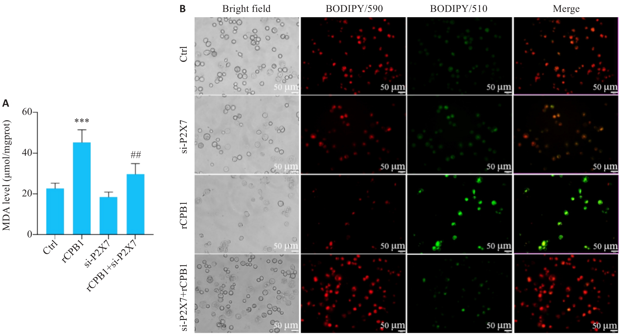 Fig.8 P2X7 receptor knockdown lowers lipid peroxidation levels in rCPB1-treated THP-1 cells. A: The levels of MDA in Ctrl group, rCPB1 group, si-P2X7 group, and si-P2X7+rCPB1 group. B: Fluorescence images in the 4 groups of cells. ***P<0.001 vs Ctrl; ##P<0.01 vs rCPB1 (n=3).