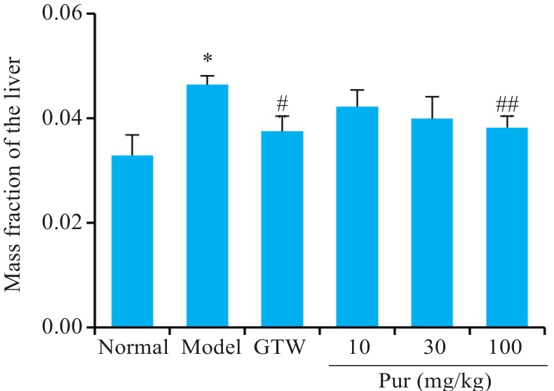 Objective To explore the therapeutic mechanism of puerarin for alleviating synovitis in rats with collagen-induced arthritis (CIA). Methods In a SD rat model of CIA, we tested the effects of daily gavage of puerarin at low, moderate and high doses (10, 30, and 100 mg/kg, respectively) for 3 weeks, with tripterygium glycosides (GTW, 10 mg/kg) as the positive control, on swelling in the hind limb joints regions evaluated by arthritis index scoring. Mass fraction of the liver of the rats was calculated, and pathologies in joint synovial membrane were observed with HE staining. The expressions of transforming growth factor β‑activated kinase-1 (TAK1), Toll-like receptor 4 (TLR4), and nuclear factor kappa-Bp65 (NF‑κB p65) at the mRNA and protein levels in the synovial tissues were detected using Real-time PCR and Western blotting. Results Compared with those in the model group, the rats in GTW group and high-dose puerarin group showed significantly reduced mass fraction of the liver. Treatment with GTW and puerarin at the 3 doses all significantly alleviated plantar swelling, lowered arthritis index scores, and improved synovitis in CIA rats (P<0.05), and the effects of puerarin showed an obvious dose dependence. Both GTW and puerarin treatments significantly lowered TAK1, TLR4, and NF‑κB p65 mRNA and protein expressions in the synovium of CIA rats. Conclusion Puerarin alleviates synovium damages in CIA rats possibly by suppressing the TLR4/NF‑κB signaling pathway via downregulating TAK1 expression.