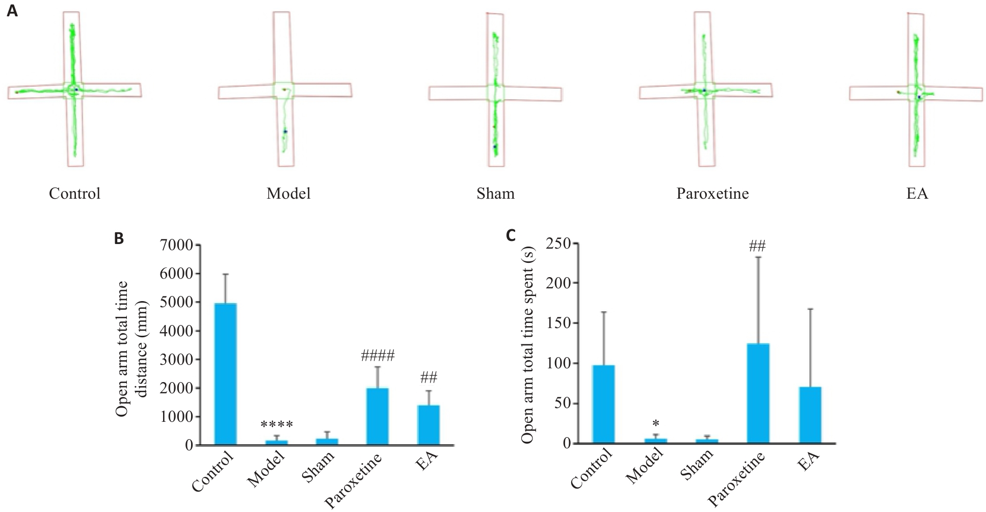 目的 观察电针治疗对创伤后应激障碍(PTSD)大鼠海马线粒体超微结构及Bcl-2、Bax、caspase-3基因和蛋白表达的影响,探讨其治疗作用及机制。 方法 40只SPF级SD雄性大鼠随机分为空白对照组、模型组、假针刺组、帕罗西汀组、电针组,8只/组。采用连续单一应激联合足底电刺激建立PTSD模型,空白组和模型组不予以治疗,电针组针刺“百会”“神庭”及双侧“肝俞”“肾俞”,假针刺组大鼠浅刺腧穴旁开5 mm 处,不连接电针仪,15 min/次,5次/周,持续3周。帕罗西汀组给予帕罗西汀混悬液(10 mg/kg)灌胃,5次/周,持续3周。治疗后通过旷场实验和高架十字迷宫实验评估行为学变化,HE染色和尼式染色观察海马病理及神经细胞变化,电镜观察线粒体超微结构,实时荧光定量PCR和免疫荧光检测Bcl-2、Bax、caspase-3的mRNA及蛋白表达。 结果 与空白组相比,模型组大鼠旷场活动总距离、高架十字迷宫开臂区域活动路程及时间明显减少(P<0.05);海马神经细胞数量减少,细胞皱缩、空泡增多、血管周围水肿,线粒体肿胀、膜破损、嵴减少;海马神经细胞数量明显减少(P<0.0001);Bcl-2表达下降,Bax、caspase-3表达上升(P<0.0001);与模型组相比,帕罗西汀组和电针组旷场活动总距离、高架十字迷宫开臂区域路程明显增加(P<0.01);尼氏染色神经细胞数量增加(P<0.05);海马神经元皱缩减少,细胞形态更规则、排列更整齐,且神经元结构染色较均匀;线粒体结构较为完整;Bcl-2表达上升,Bax、caspase-3表达下降(P<0.001);帕罗西汀组高架十字迷宫开臂区域活动时间增加,电针组仅呈上升趋势(P>0.05);假针刺组无明显改善。 结论 电针可能通过上调Bcl-2、下调Bax和caspase-3,改善海马线粒体损伤,发挥对PTSD大鼠的治疗作用。