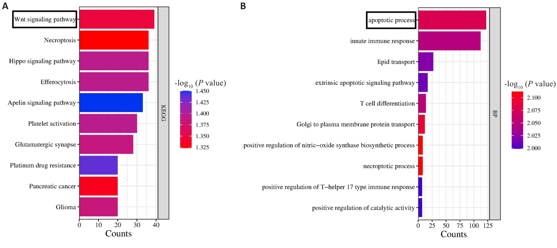Fig.4 KEGG and GO enrichment analysis of TMCO1. A: KEGG enrichment analysis shows that TMCO1 is related to the Wnt signaling pathway. B: GO enrichment analysis shows that TMCO1 is associated with cell apoptosis process.