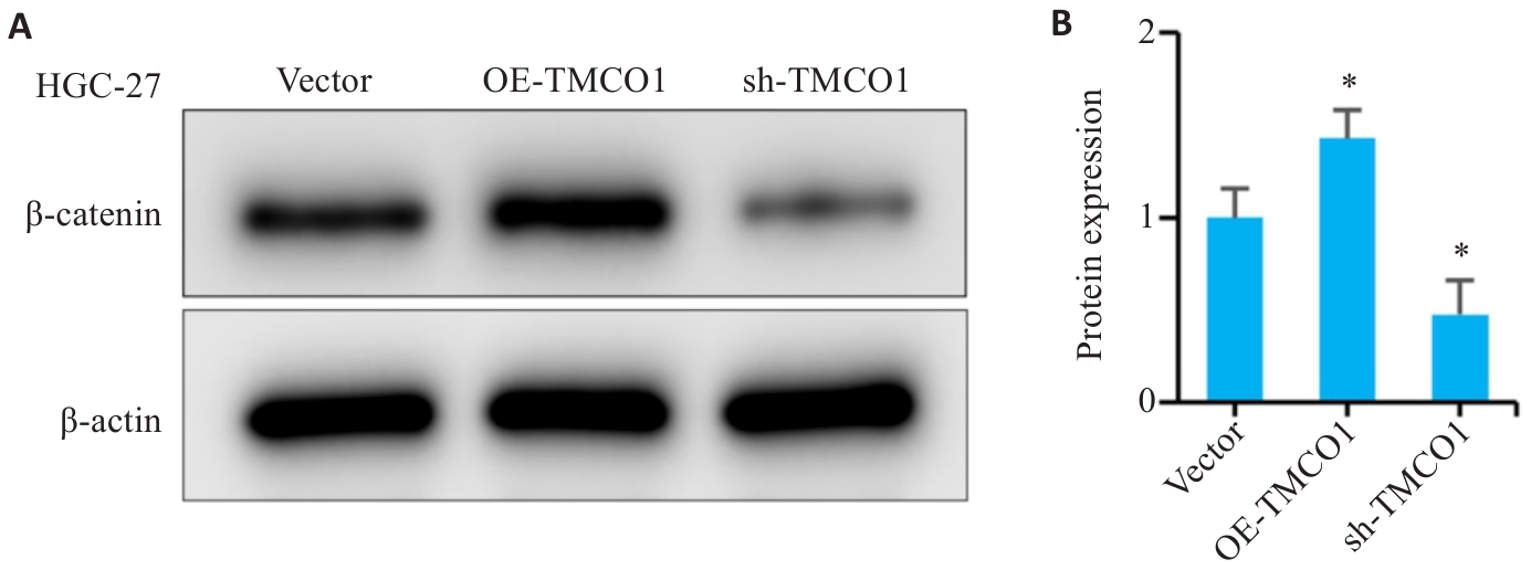 Fig.7 TMCO1 regulates the Wnt signaling pathway in gastric cancer cells. A: Detection of β‑catenin protein expression in HGC-27 cells with TMCO1 overexpression or silencing by Western blotting. B: Analysis of the IOD values of β‑catenin in HGC-27 cells. *P<0.05 vs Vector group.