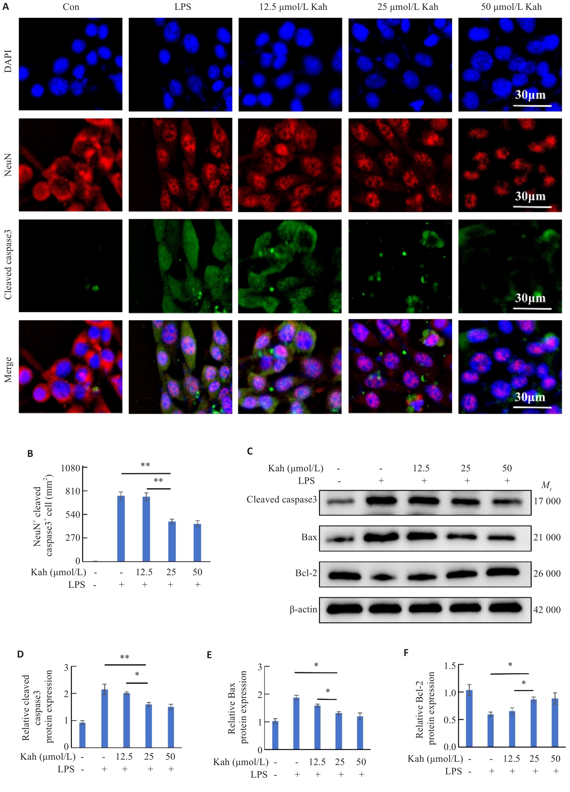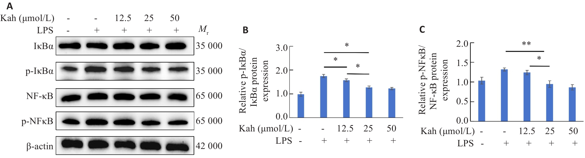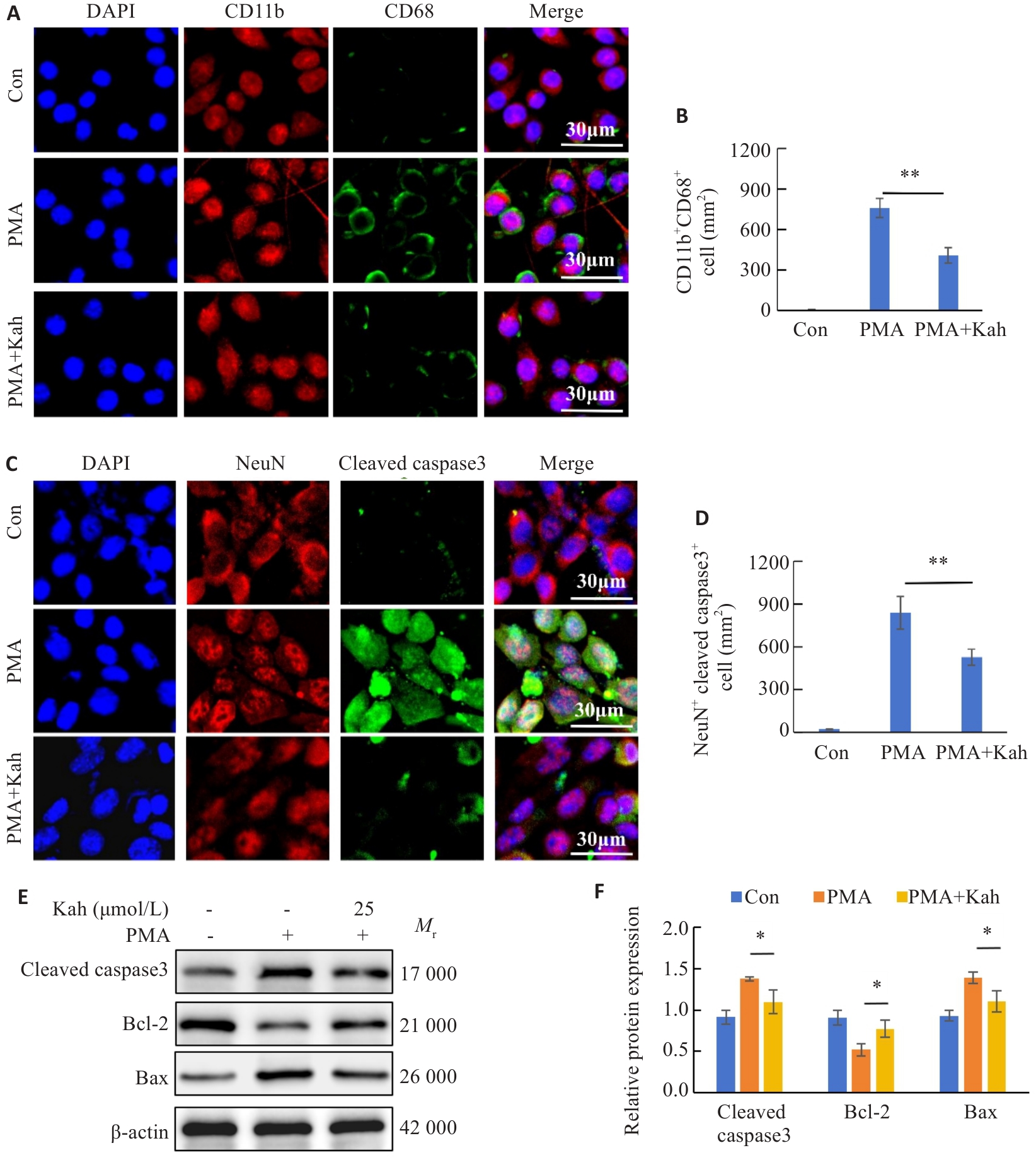目的 探究咖啡豆醇(Kah)在脊髓损伤后通过抑制小胶质细胞活化介导的炎症反应对运动功能恢复的影响,并阐明其作用机制。 方法 随机将54只8~10周龄的C57BL/6J小鼠分为Sham组(只进行椎板剥离), 脊髓损伤(SCI)组(剥离椎板并撞击脊髓),Kah组(术后每日腹腔注射20 mg/kg的Kah),18只/组。采用BMS评分、足迹分析、游泳实验评估小鼠的运动功能。通过HE、快蓝染色及尼氏染色评估脊髓损伤区域、髓鞘完整性和神经元存活。使用脂多糖刺激BV2细胞建立体外炎症模型及BV2/HT22神经元共培养体系,利用不同浓度Kah干预,通过免疫荧光对体内外活化的小胶质细胞及神经元凋亡的数量进行评估;通过Western blotting检测凋亡相关蛋白(Bax/Bcl-2/cleaved caspase3)及IκBα/NF-κB通路蛋白。通过qRT-PCR 、ELISA检测炎症因子(TNF-α、IL-6、IL-1β)水平。使用NF-κB通路激活剂PMA于体外实验进行干预,分析Kah的作用机制。 结果 Kah治疗改善了SCI小鼠的运动功能;组织学检测显示,Kah组脊髓组织病理性损伤区域较SCI组缩小(P<0.001),同时髓鞘化面积及神经元数目增加(P<0.001);体内外实验显示,Kah通过抑制小胶质细胞的活化并减少其释放炎症因子缓解神经元凋亡;Western blotting结果显示,Kah可降低NF-κB及IκBα的磷酸化水平。体外免疫荧光结果证实,与Kah干预组相比,给予PMA后,活化的BV2细胞及凋亡的神经元增加(P<0.05)。 结论 Kah通过抑制NF-κB通路调控小胶质细胞活化来促进SCI后运动功能的恢复,为临床治疗提供了潜在新策略。