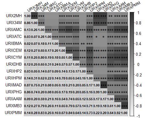 Fig.1 Correlation between the 15 mVOCs included in the study. The numbers in the figure represent the correlation coefficients between two VOCs. Darkest shades indicate a strong positive correlation (close to 1), while the light shades indicate a strong negative correlation (close to -1). The asterisks (*) within the squares denote the statistical significance of the correlation coefficients. *P<0.05, ** P<0.01, ***P<0.001).