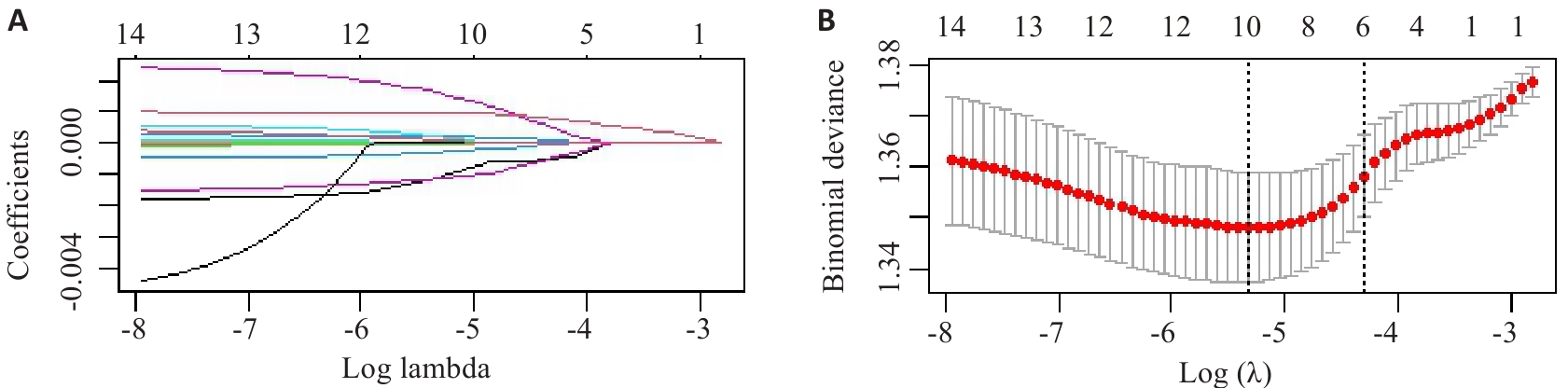 Fig.2 LASSO regression analysis of the 15 types of mVOCs included in the study. A: Screening pathway for mVOCs associated with MASLD risk. B: Correlation between log-transformed λ and MSE. The red dashed line and its error bars in B represent the mean MSE values and their corresponding 95% confidence intervals (95% CI). The left black dashed line indicates the optimal λ value yielding the minimum MSE, while the right black dashed line shows the λ value from the simplest model obtained at one standard error below the minimum MSE.
