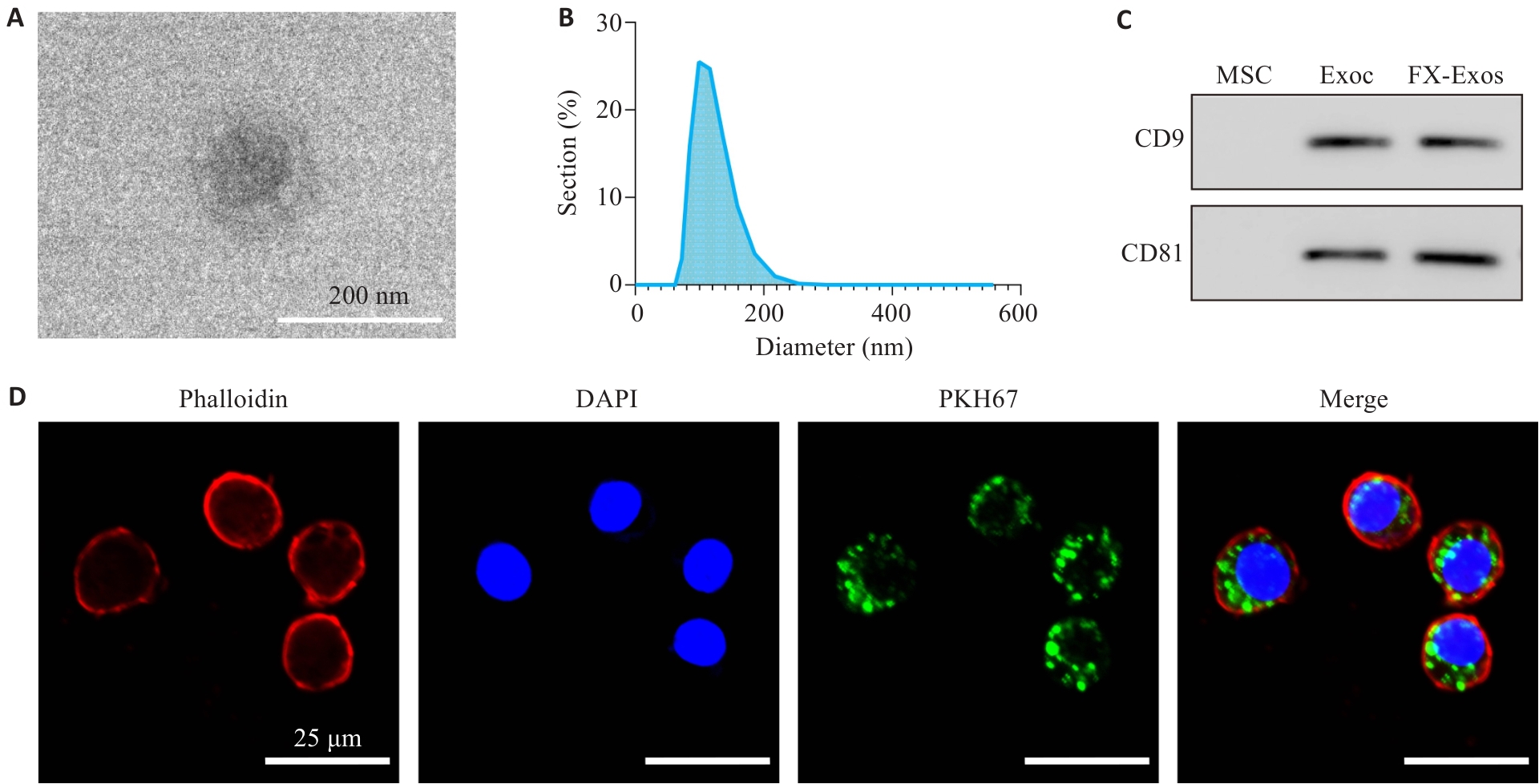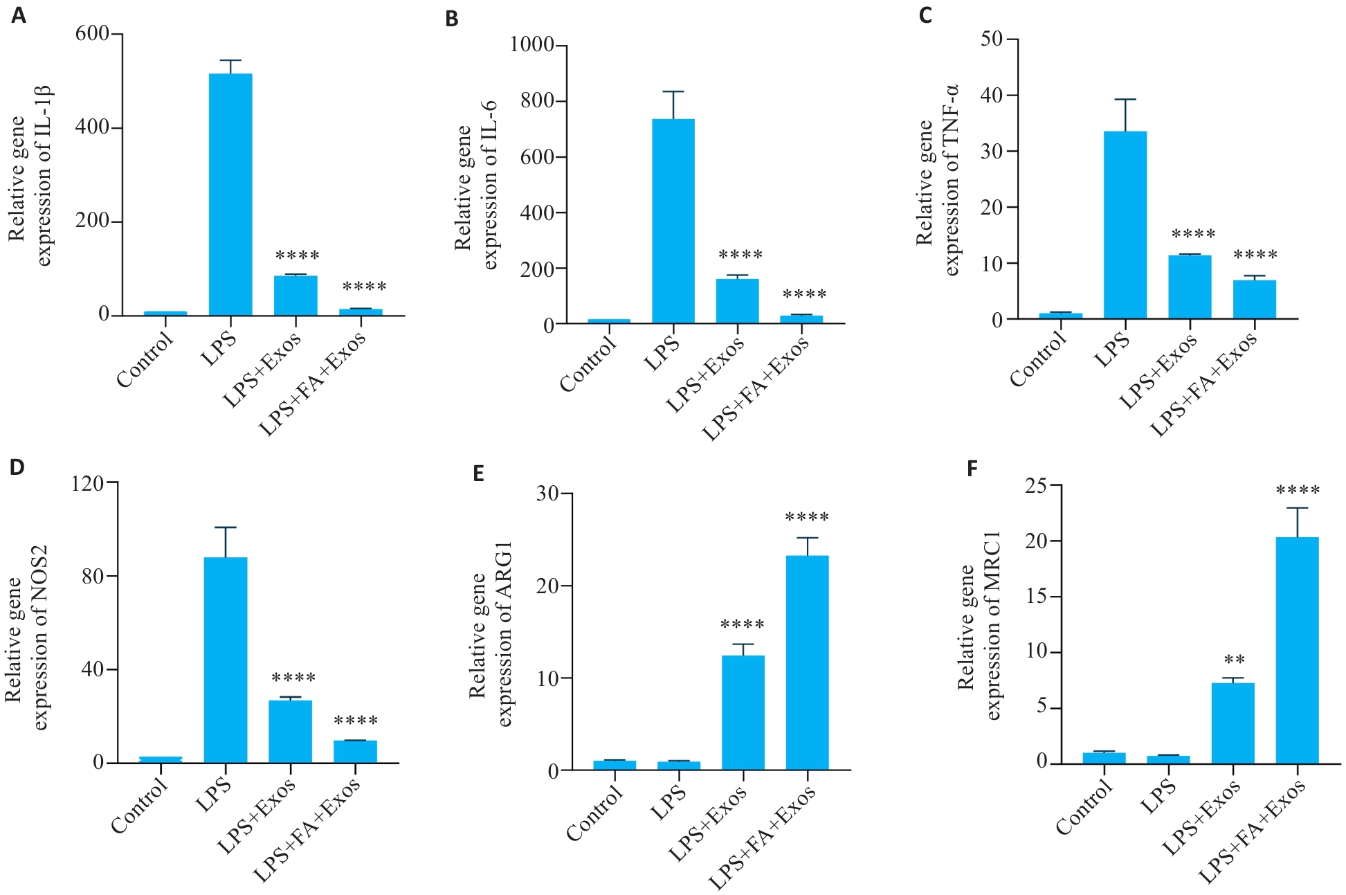 目的 探讨叶酸(FA)修饰的髌下脂肪垫间充质干细胞(IPFP-MSCs)来源外泌体(Exos)通过调控巨噬细胞M1/M2极化改善膝骨关节炎(KOA)炎症微环境的作用。 方法 提取培养IPFP-MSCs,加入FA进行处理,利用超速离心法分离Exos。将RAW264.7细胞分为对照组(未处理)、脂多糖(LPS)组(加入LPS)、LPS+Exos组(加入LPS及Exos)和LPS+FA-Exos组(加入LPS及FA修饰的Exos),分别处理12 h。采用透射电镜、纳米颗粒跟踪分析和Western blot鉴定外泌体,使用共聚焦显微镜观察其摄取情况。通过qRT-PCR、ELISA、流式细胞术和免疫荧光检测各组促炎因子(IL-1β、IL-6、TNF-α、iNOS)与抗炎因子(ARG1、MRC1、CD206)表达水平。 结果 透射电镜显示IPFP-Exos呈典型杯状,CD9与CD81蛋白表达阳性;共聚焦结果证实其可被巨噬细胞摄取。qRT-PCR与ELISA结果表明,LPS+FA-Exos组促炎因子IL-1β、IL-6、TNF-α、NOS2表达较LPS组显著下降(P<0.0001),抗炎因子ARG1、MRC1表达升高(P<0.0001)。流式检测显示,FA-Exos组CD86阳性比例下降,CD206及其比值升高(P<0.0001)。免疫荧光显示FA-Exos组iNOS表达减少(P=0.0478),CD206表达增强(P=0.0003)。 结论 FA-Exos可有效调控巨噬细胞由M1型向M2型极化,免疫调节作用优于未修饰Exos,这种双重调控机制可有效缓解关节腔促炎微环境,为KOA的靶向治疗提供了新型外泌体修饰策略。