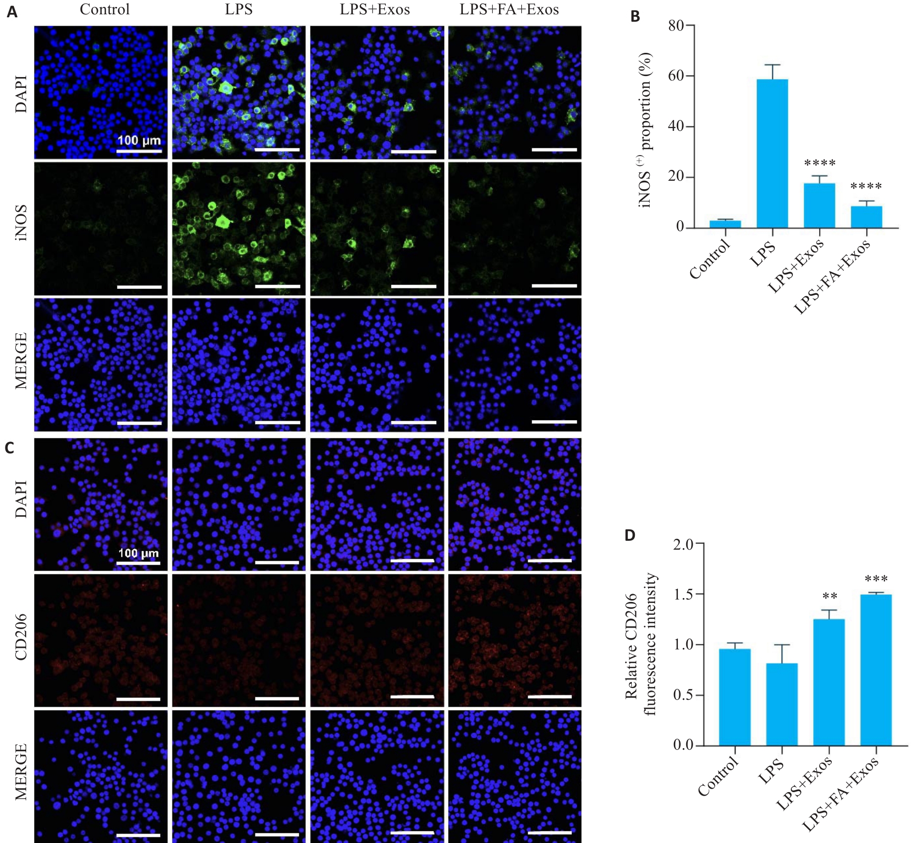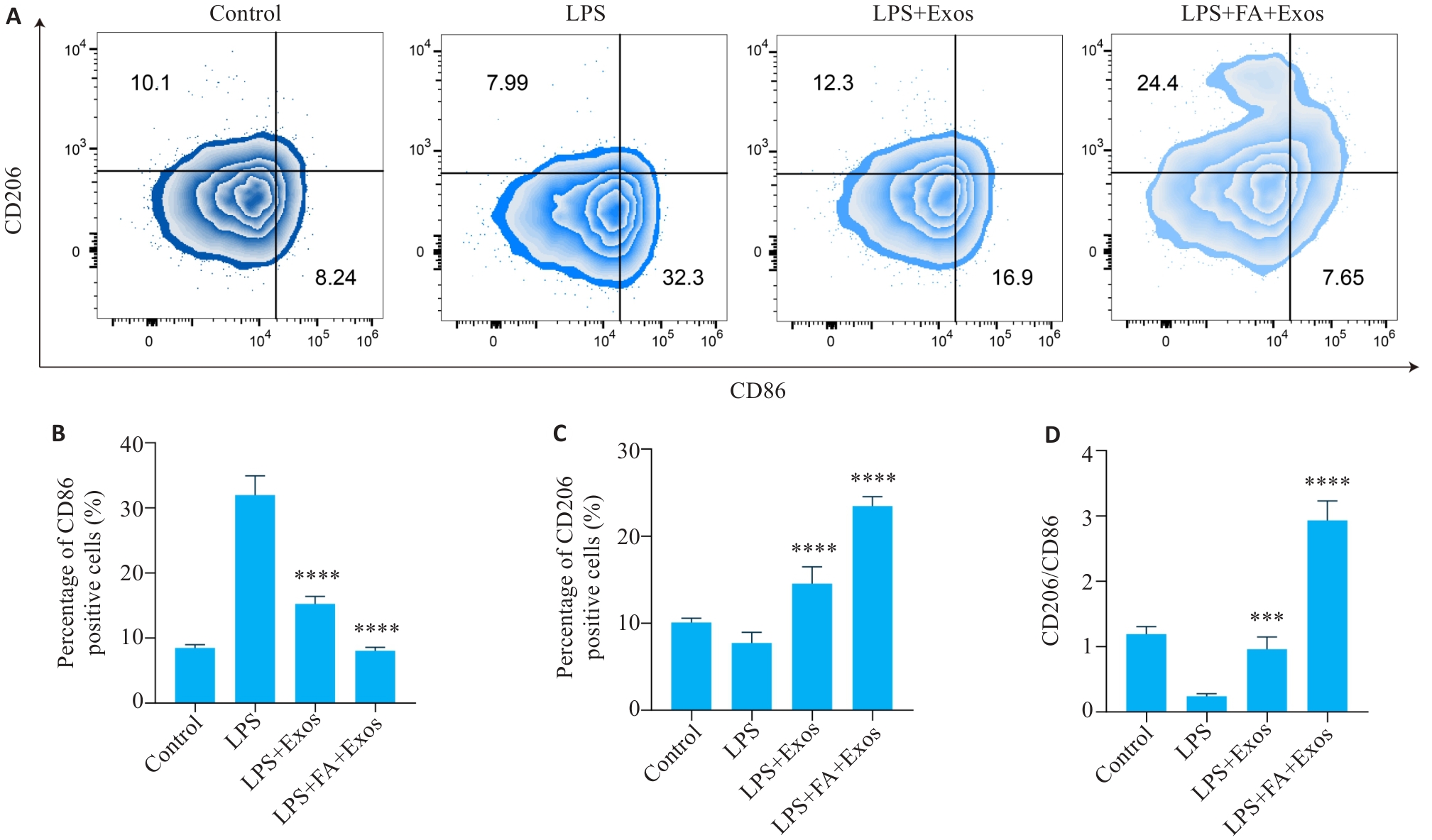 Objective To evaluate the effect of exosomes derived from folic acid (FA)-treated infrapatellar fat pad mesenchymal stem cells (IPFP-MSCs) on M1 and M2 polarization of macrophages in vitro. Methods Infrapatellar fat pad tissues were obtained from surgical patients without knee osteoarthritis to isolate IPFP-MSCs. The exosomes were extracted from the cell cultures with or without FA treatment and identified by transmission electron microscopy, TEM, NTA and Western blotting. RAW264.7 cells were induced with lipopolysaccharide (LPS) and incubated with exosomes from FA-treated or untreated IPFP-MSCs for 12 h, and Exos uptake was observed using confocal microscopy. The changes in expression levels of IL-1β, IL-6, TNF-α, iNOS, ARG1, MRC1, and CD206 in the macrophages were detected using qRT-PCR, ELISA, flow cytometry and immunofluorescence staining. Results The exosomes derived from IPFP-MSCs showed a typical cup shape, were positive for CD9 and CD81, and could be uptaken by macrophages. In LPS-induced macrophages, incubation with exosomes from FA-treated IPFP-MSCs significantly decreased the expressions of IL-1β, IL-6, TNF‑α, and NOS2, and increased the expressions of ARG1 and MRC1. Treatment of the macrophages with exosomes from FA-treated IPFP-MSCs significantly lowered CD86-positive cell percentage, increased CD206-positive cells and the CD206/CD86 ratio, lowered cellular expression of iNOS, and enhanced the expression of CD206. Conclusion Exosomes from FA-treated IPFP-MSCs promotes M2 polarization of macrophages more effectively than exosomes from unmodified IPFP-MSCs, suggesting a new exosome modification strategy for targeted treatment of knee osteoarthritis.