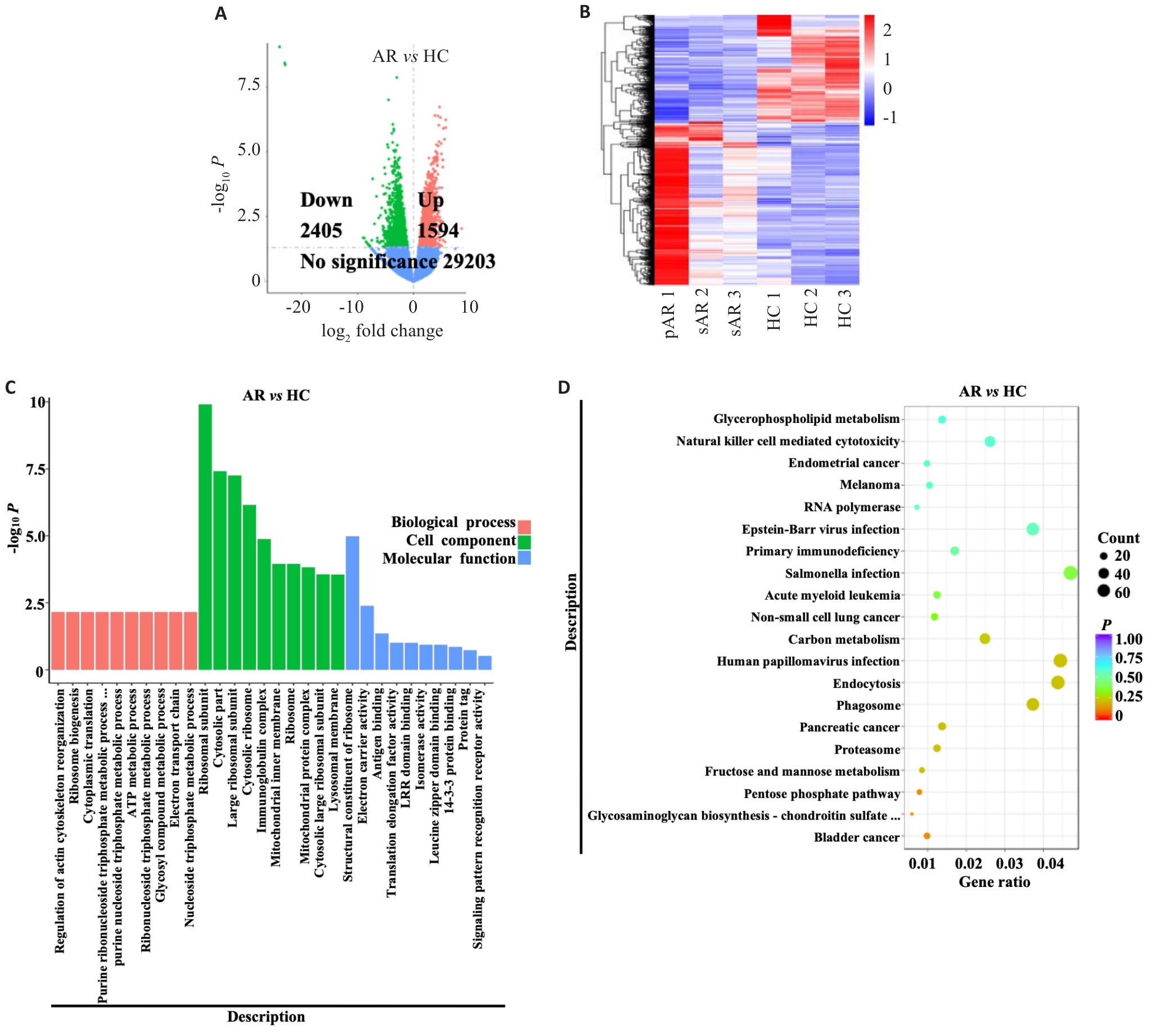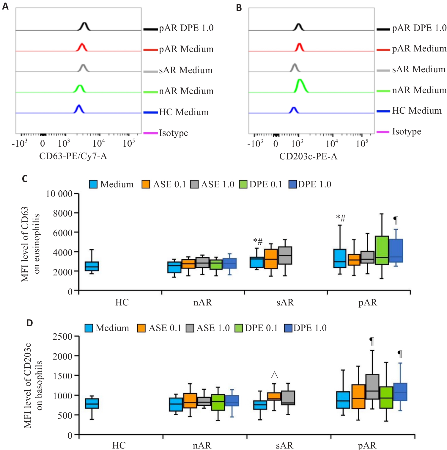 目的 探讨变应原对变应性鼻炎(AR)患者血液CCR3+粒细胞亚型活化的影响。 方法 流式细胞术检测变应原对AR患者血液粒细胞群CCR3+CD203c-嗜酸性粒细胞和CCR3+CD203c+嗜碱性粒细胞活化分子CD63和CD203c表达水平的影响。多重免疫荧光分析和ELISA技术分别检测志愿者血浆IL-25和TSLP的水平,并分析其与嗜酸性粒细胞和嗜碱性粒细胞数量的相关性。转录组测序AR患者血液CD16-粒细胞,并富集分析其差异表达基因的功能和潜在机制。 结果 AR患者CCR3+粒细胞中嗜酸性粒细胞和嗜碱性粒细胞的比例增加(P<0.005),变应原诱导嗜碱性粒细胞的比例增加(P<0.005)。季节性AR(sAR)和常年性AR(pAR)而非皮肤点刺试验阴性的AR(nAR)患者血液粒细胞群中嗜酸性粒细胞CD63的平均荧光强度表达水平增强(P<0.005),变应原诱导pAR患者嗜酸性粒细胞和嗜碱性粒细胞CD63和CD203c平均荧光强度的表达水平增强(P<0.005)。AR患者升高的血浆IL-25和TSLP水平与增加的嗜酸性粒细胞和嗜碱性粒细胞的数量相关(均P<0.005)。皮肤点刺试验阳性AR患者CD16-粒细胞差异表达的3999个基因在蛋白合成、能量代谢和免疫功能等方面发生了潜在变化,内吞作用、吞噬体和碳代谢等通路可能参与上述变化。 结论 本研究深化了对血液粒细胞群中CCR3+嗜酸性粒细胞和嗜碱性粒细胞参与皮肤点刺试验阳性AR发病机制的理解,揭示了AR治疗的潜在靶点。