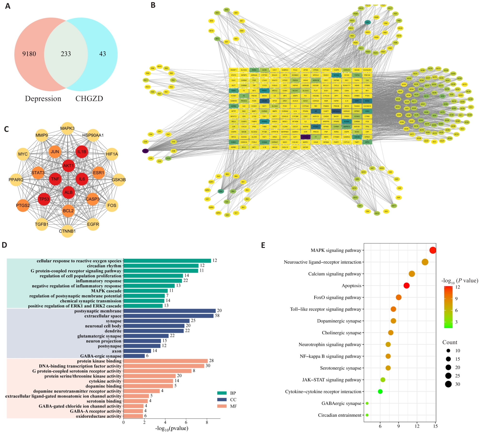 Fig.1 Network pharmacology analysis of the mechanisms by which Modified Chaihu Guizhi Decoction (MCGD) alleviates anxiety- and depression-like behavior in CUMS. A: Venn diagram of shared targets between MCGD and depression. B: Component-target-disease map. C: Core intersection targets. D: Gene Ontology (GO) analysis of the shared targets, categorized into Biological Processes (BP), Molecular Functions (MF), and Cellular Components (CC). E: Bubble chart of Kyoto Encyclopedia of Genes and Genomes (KEGG) pathway enrichment analysis for the shared targets.