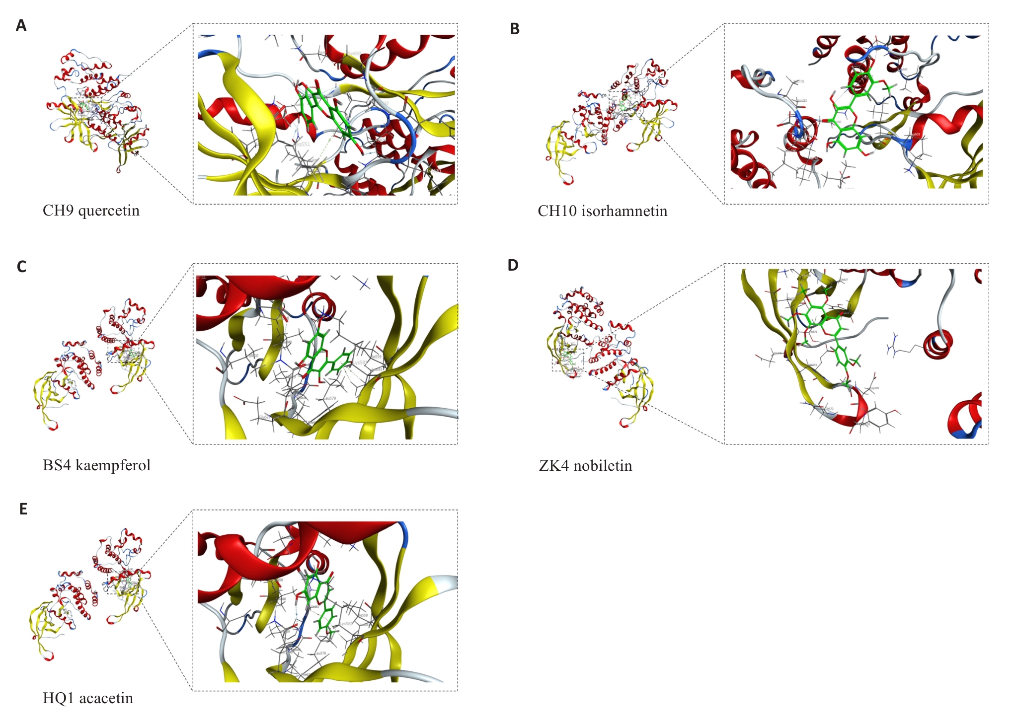 Fig.2 Visualization of the results of molecular docking analysis. A: Docked molecular conformation of JAK2 with CH9. B: Molecular conformation of JAK2 docked with CH10. C: Molecular conformation of JAK2 docked with BS4. D: Molecular conformation of JAK2 docked with ZK4. E: Molecular conformation of JAK2 docked with HQ1.