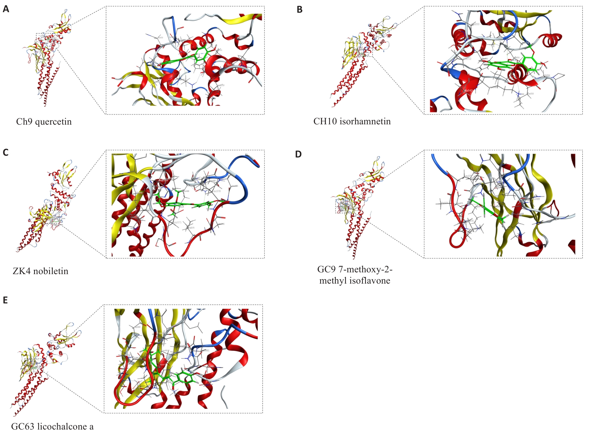 Fig.3 Visualization of the results of molecular docking analysis. A: Docked molecular conformation of STAT3 with CH9. B: Molecular conformation of STAT3 docked with CH10. C: Molecular conformation of STAT3 docked with ZK4. D: Molecular conformation of STAT3 docked with GC9. E: Molecular conformation of STAT3 docked with GC63.