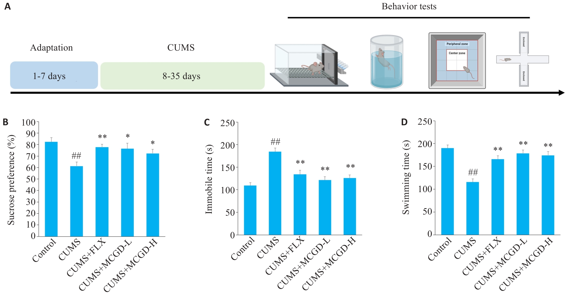 Fig.4 MCGD significantly improves depression-like behavior in CUMS mice. A: Experimental design. B: Sucrose preference percentage in the sucrose preference test (SPT). C: Immobility time in the forced swim test (FST). D: Swimming times in the FST. Data are presented as Mean±SD (n=15). Statistical analysis was performed using one-way ANOVA followed by Tukey's post hoc test. ##P<0.01 vs Control group; *P<0.05, **P<0.01 vs CUMS group.