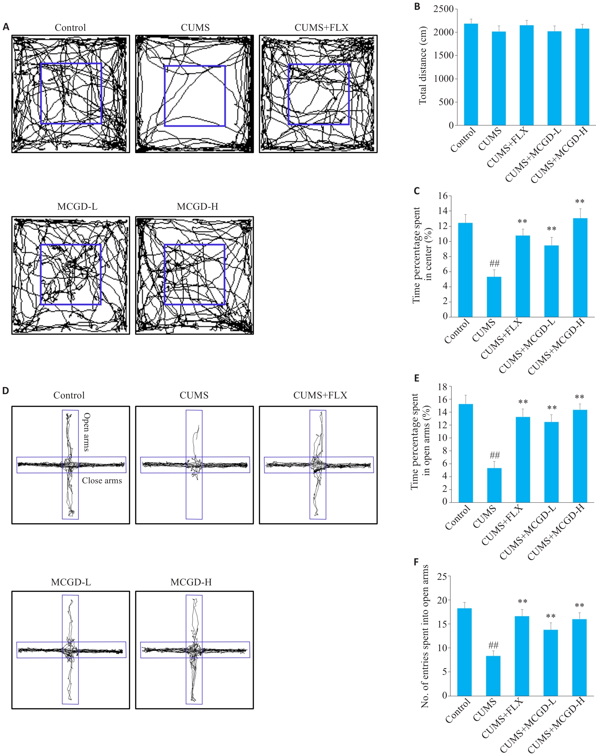 Fig.5 MCGD significantly improves anxiety-like behavior in CUMS mice. A: Trajectory map in the open field test (OFT). B: Total distance in OFT. C: Time percentage spent in center of OFT. D: Trajectory map in the elevated plus maze test (EPM). E: Time percentage spent in open arms of EPM. F: Number of entries spent into open arms of EPM. Data are presented as Mean±SD (n=15). Statistical analysis was performed using one-way ANOVA followed by Tukey's post hoc test. ##P<0.01 vs Control group; **P<0.01 vs CUMS group.