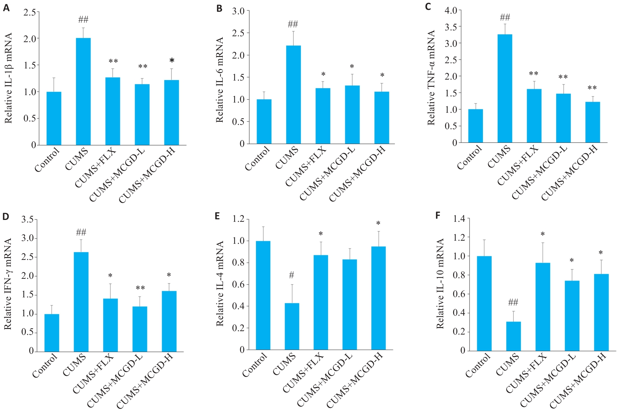 Fig.6 Effects of MCGD on mRNA expression of inflammatory factors in the hippocampus of CUMS mice. A: Relative mRNA level of IL-1β. B: Relative mRNA level of IL-6. C: Relative mRNA level of TNF-α. D: Relative mRNA level of IFN-γ. E: Relative mRNA level of IL-4. F: Relative mRNA level of IL-10. Data are presented as Mean±SD (n=6). Statistical analysis was performed using one-way ANOVA followed by Tukey's post hoc test. #P<0.05, ##P<0.01 vs Control group; *P<0.05, **P<0.01 vs CUMS group.