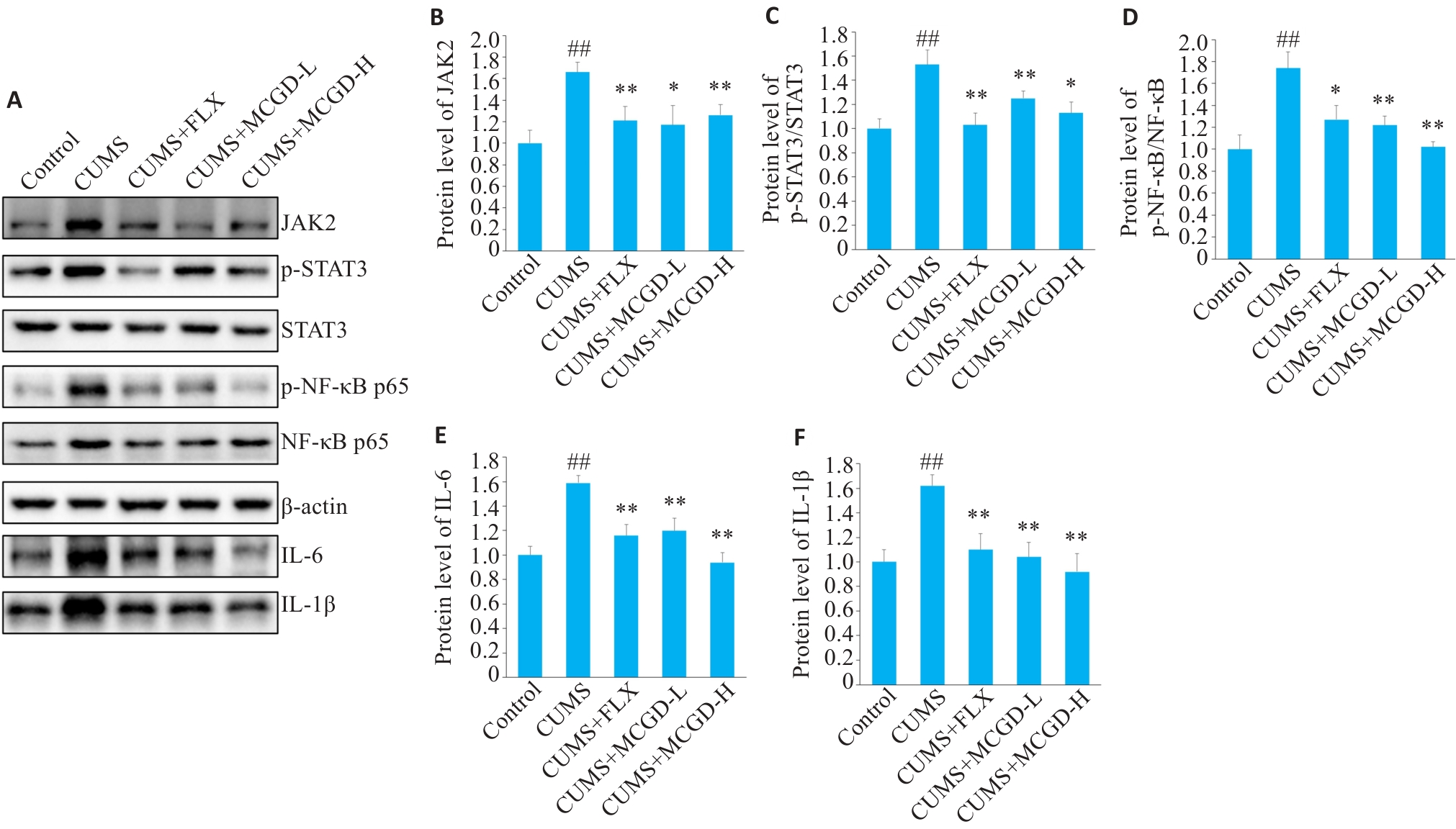 Fig.7 Effects of MCGD on the JAK2/STAT3 signaling pathway in the hippocampus of CUMS mice. A: Protein bands of JAK2, p-STAT3, STAT3, p-NF-κB, NF-κB, IL-1β, and IL-6 detected by Western blotting. B-F: Quantitative analysis of JAK2, p-STAT3, STAT3, p-NF-κB, NF-κB, IL-6, and IL-1β protein expression levels. Data are presented as Mean±SD (n=3). Statistical analysis was performed using one-way ANOVA followed by Tukey's post hoc test. ##P<0.01 vs Control group; *P<0.05, **P<0.01 vs CUMS group.