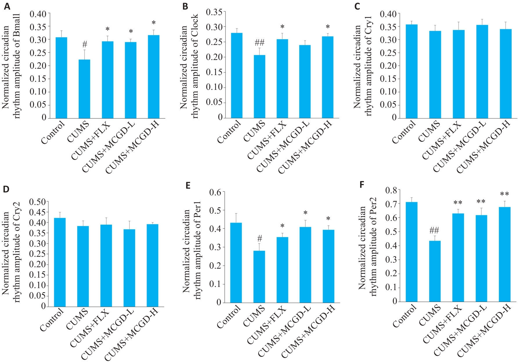 Fig.8 Regulatory effect of MCGD on expression levels of clock protein genes in the hippocampus of CUMS mice. A: Normalized circadian rhythm amplitude of Bmal1. B: Normalized circadian rhythm amplitude of Clock1. C: Normalized circadian rhythm amplitude of Cry1. D: Normalized circadian rhythm amplitude of Cry2. E: Normalized circadian rhythm amplitude of Per1. F: Normalized circadian rhythm amplitude of Per2. Data are presented as Mean±SD (n=3). Statistical analysis was performed using one-way ANOVA followed by Tukey's post hoc test. #P<0.05, ##P<0.01 vs Control group; *P<0.05, **P<0.01 vs CUMS group.