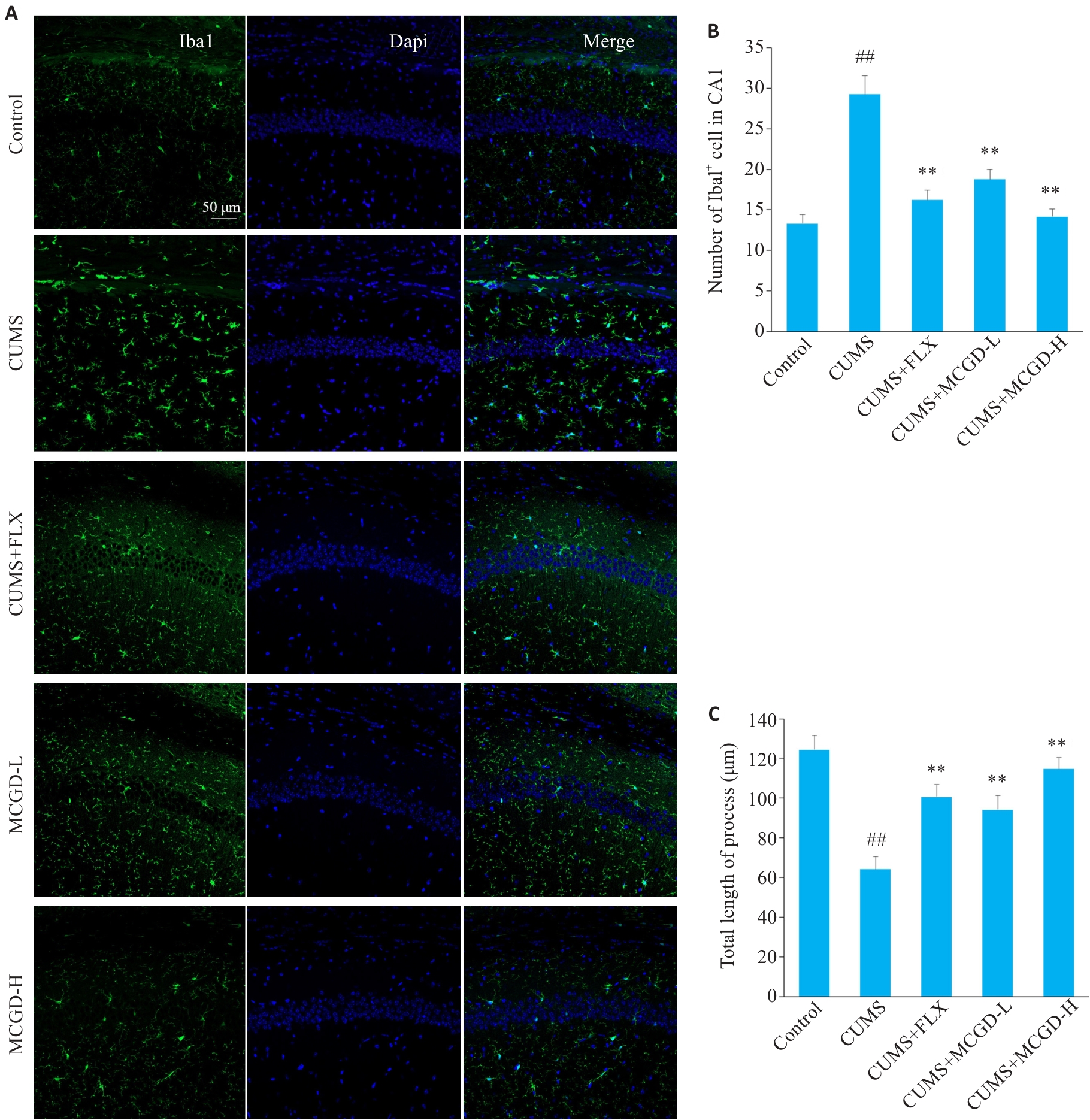Fig.9 Effects of MCGD on microglia activation level in the hippocampal CA1 region of CUMS mice. A: Immunofluorescence images of Iba1 expression (Original magnification: ×200). B: Statistics of Iba1+ cells in the hippocampal CA1 region. C: Statistics of microglia total length of process in the hippocampal CA1 region. Each group included 3 mice, and 4 slices were analyzed per mouse. Data are presented as Mean±SD. Statistical analysis was performed using one-way ANOVA followed by Tukey's post hoc test. ##P<0.01 vs Control group; **P<0.01 vs CUMS group.