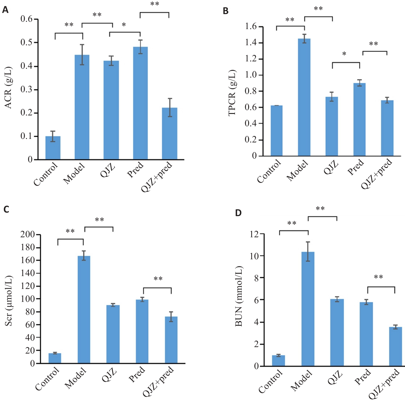 Fig.1 Comparison of renal function among different groups of MRL/lpr mice. A: Expression levels of ACR in MRL/lpr mice in each group. B: Expression levels of TPCR in each group. C: Expression levels of Scr in each group. D: Expression levels of BUN in each group. *P<0.05, **P<0.01.