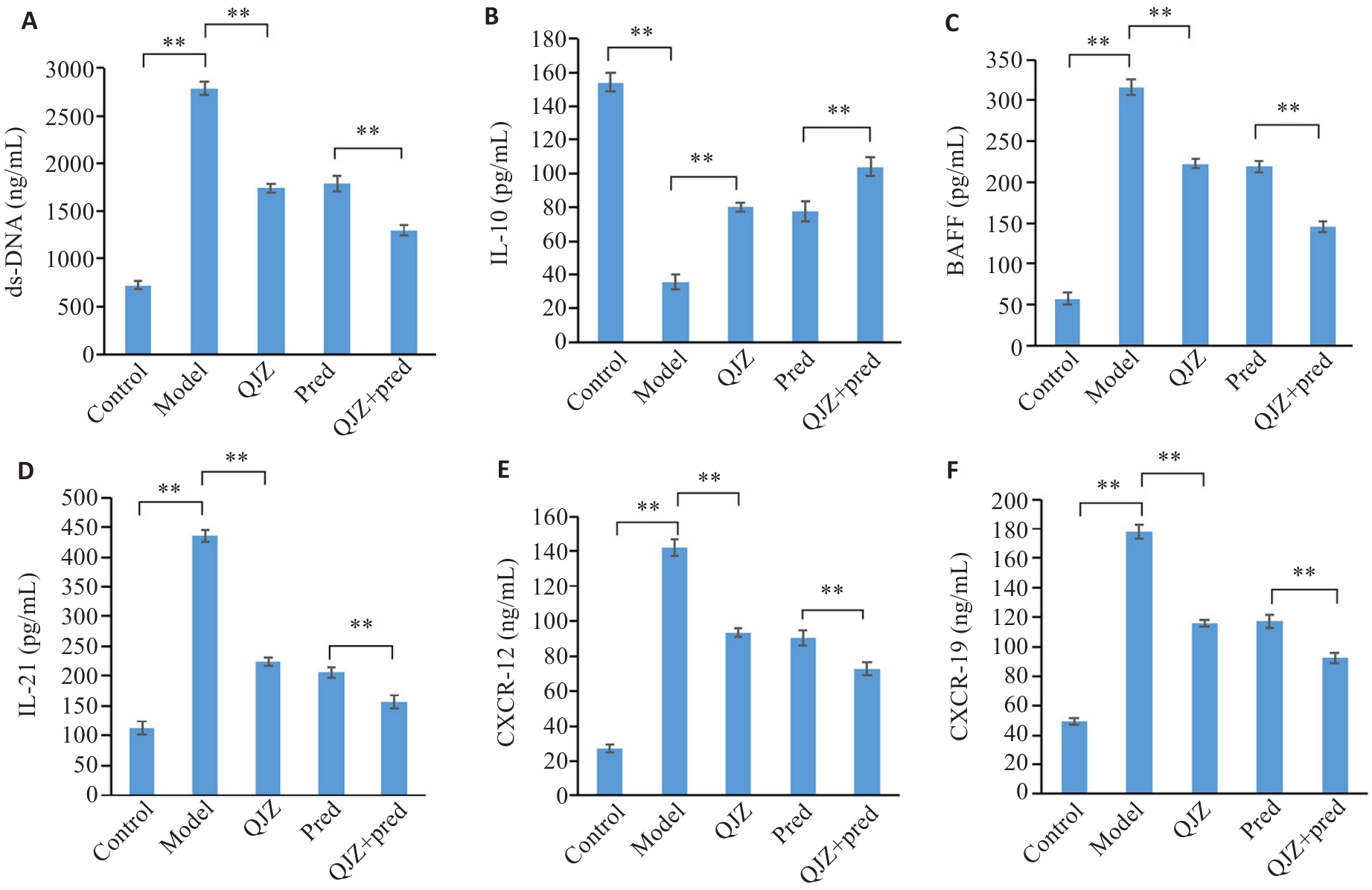 Fig.2 Comparison of ds-DNA antibody, cytokine and chemokine levels in MRL/lpr mice in each group. A: Levels of ds-DNA in each group. B: Levels of IL-10 in each group. C: Levels of BAFF in each group. D: Levels of IL-21 in each group. E: Levels of CXCR-12 in each group. F: Levels of CXCR-19 in each group. **P<0.01.