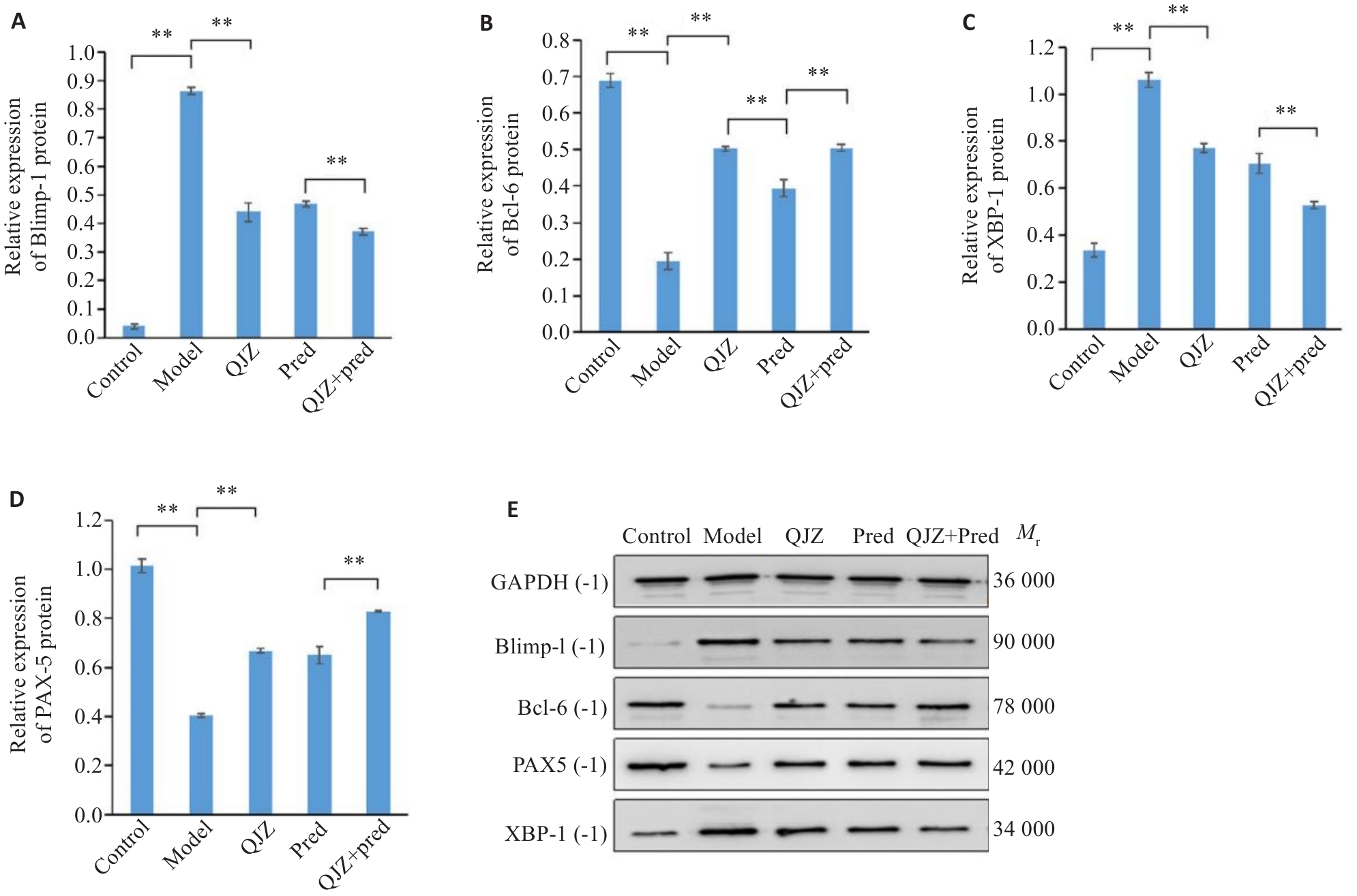 Fig.6 Comparison of expression levels of key transcriptional proteins involved in B-cell differentiation in each group. A: Relative protein expression levels of Blimp-1 in each group. B: Relative protein expression levels of Bcl-6 in each group. C: Relative protein expression levels of XBP-1 in each group. D: Relative protein expression levels of PAX-5 in each group. E: Protein bands in Western blotting in each group. **P<0.01.