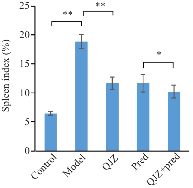 Fig.3 Effect of QJZ on renal pathology in MRL/lpr lupus mice. A: Results of HE, PAS and Masson staining of the kidneys in each group (Scale bar=50 μm). B: Comparison of pathological AI scores of the kidneys in each group. C: Comparison of pathological CI scores of the kidneys in each group. *P<0.05, **P<0.01.
