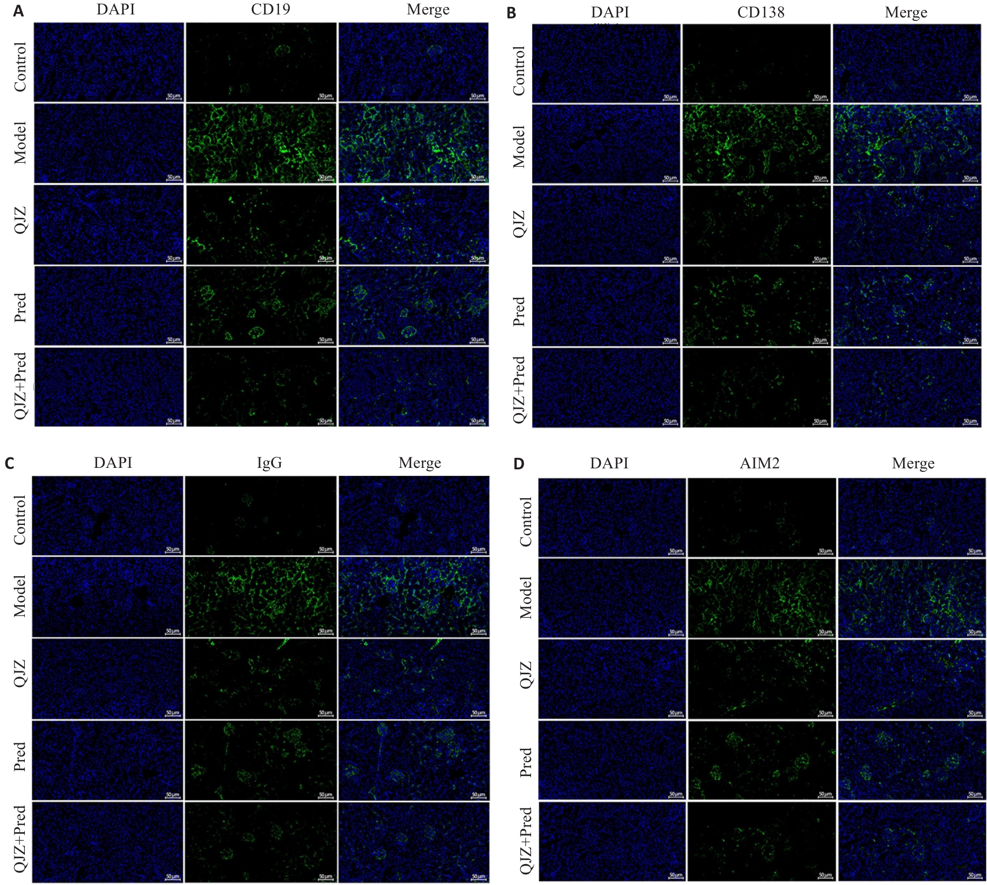 Fig.9 Expression levels of CD19, CD138, IgG and AIM2 in the renal tissues of MRL/lpr mice in each group (Immunofluorescence staining; Scale bar=50 μm). A: CD19 expression levels in each group. B: CD138 expression levels in each group. C: IgG expression levels in each group. D: AIM2 expression levels in each group.
