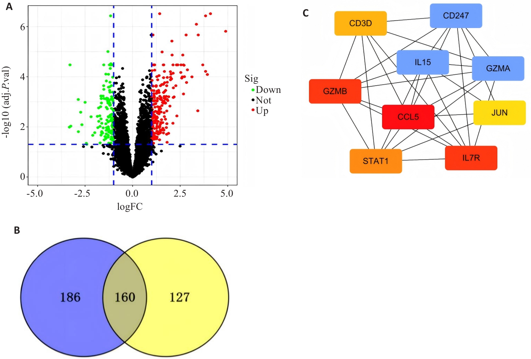 Objective To analyze the molecular mechanism of Xixian Pills for treatment of rheumatoid arthritis (RA). Methods Forty-eight rats were randomized into 6 groups (n=8), including a normal control group, a collagen-induced arthritis (CIA) model group, 3 Xixian Pills treatment (200, 400 and 800 mg/kg) groups, and a Tripterygium glycosides tablet (TGT) treatment group. In the latter 4 groups, the rats were treated with daily gavage of Xixian Pills or TGT 2 weeks after CIA modeling for 3 consecutive weeks. The differentially expressed proteins in high-dose Xixian Pills group and the model group compared with the normal control group were screened based on the tandem mass spectrometry tag (TMT) technology, and the core targets and signaling pathways were analyzed. The immune cell infiltration and gene expression data were analyzed using ggplot2 and tidyverse packages, and the correlation coefficients between the core targets and the immune cells were calculated. Results The CIA rats showed significantly increased serum levels of TNF-α and IL-6 and lowered serum IL-10 level. Treatments with high- and medium-dose Xixian Pills and TGT all significantly reduced serum TNF‑α and IL-6 and increased IL-10 levels in CIA rats. Proteomic analysis identified 160 differential proteins between the model group and high-dose Xixian Pills group, and the core targets included CCL5, STAT1, GZMB and IL7R. The areas under the ROC curve of CCL5 and STAT1 were both greater than 0.9. Immunohistochemical and immunofluorescence staining revealed increased levels of CCL5 and STAT1 in the ankle joints of CIA rats, which were significantly decreased after treatment with Xixian Pills. Conclusion Treatment with Xixian Pills offers protection of the joints in CIA rats possibly by inhibiting joint inflammation via regulating protein expressions of CCL5 and STAT1.