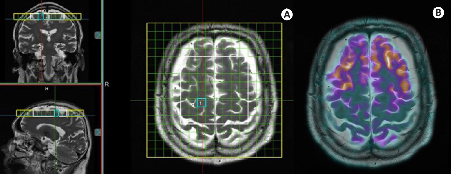 Fig.1 PET/MRS imaging of a female AD patient (76 years old, education years: 0; MMSE: 0; MoCa: 0; CDR: 3). A: Coronal, sagittal, and axial localization images of MRS acquisition site, where the yellow box indicates the homogenization region, the white box denotes the MRS acquisition area, and the blue box outlines the selected voxel. B: Co-registered PET/MR fusion image at the same level as the MRS acquisition.