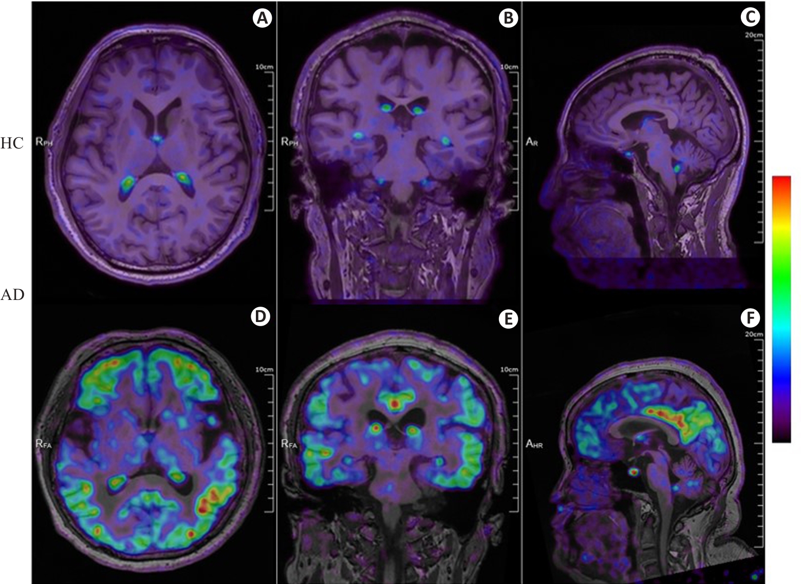Fig.2 18F-APN-1607 PET/MR fusion imaging of a healthy control individual and an AD patient. A-C: Axial, coronal, and sagittal PET/MR fusion images of the brain of a male healthy control individual (72 years old, education years: 12; MMSE: 28, MoCa: 29; CDR: 0), showing physiological uptake in the choroid plexus without significant deposition of Tau protein in the remaining cerebrum and cerebellum. D-F: Axial, coronal, and sagittal PET/MR fusion images of the brain of a female AD patient (58 years old, education years: 12; MMSE: 5; MoCa: 2; CDR: 2) with diffuse and heterogeneous Tau protein deposition in the bilateral frontal, parietal, temporal, and occipital cortical regions. The color bar in the figure represents SUV.