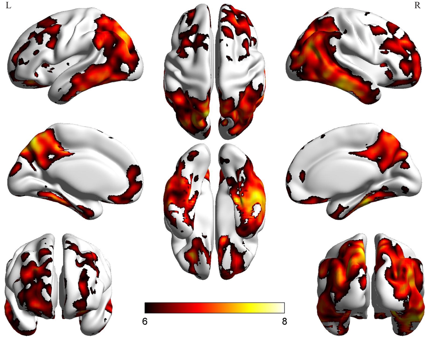 Fig.3 Regions of significantly increased Tau protein deposition in the PT group as determined by voxel-based analysis methods. The color bar in the figure represents the statistical t-values; L: Left cerebral hemisphere; R: Right cerebral hemisphere.