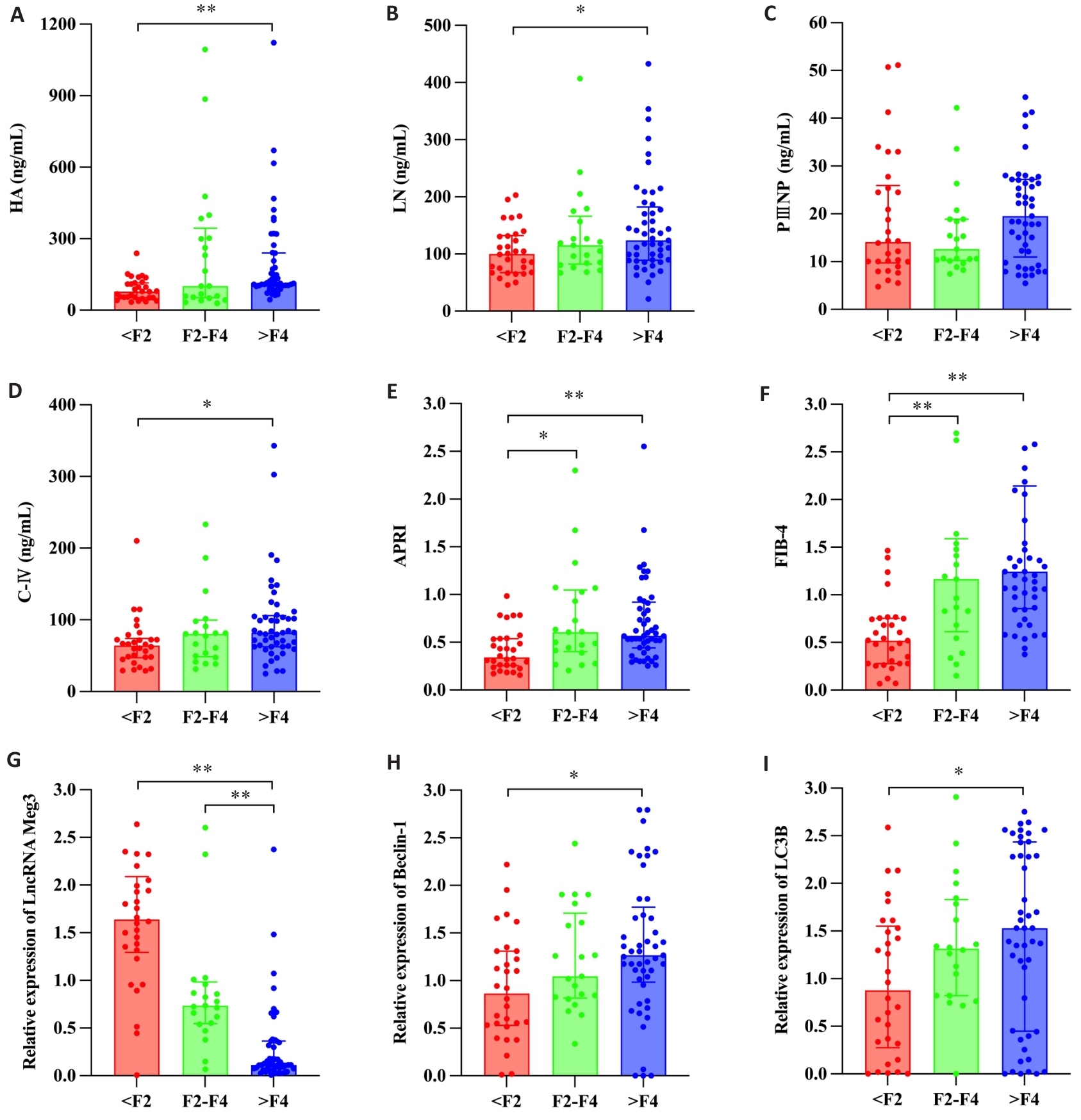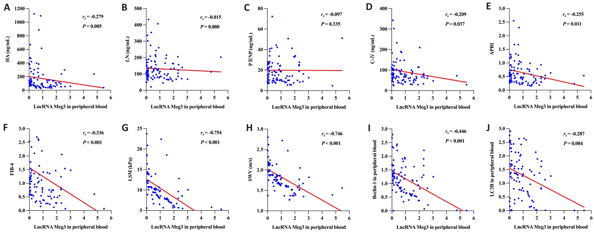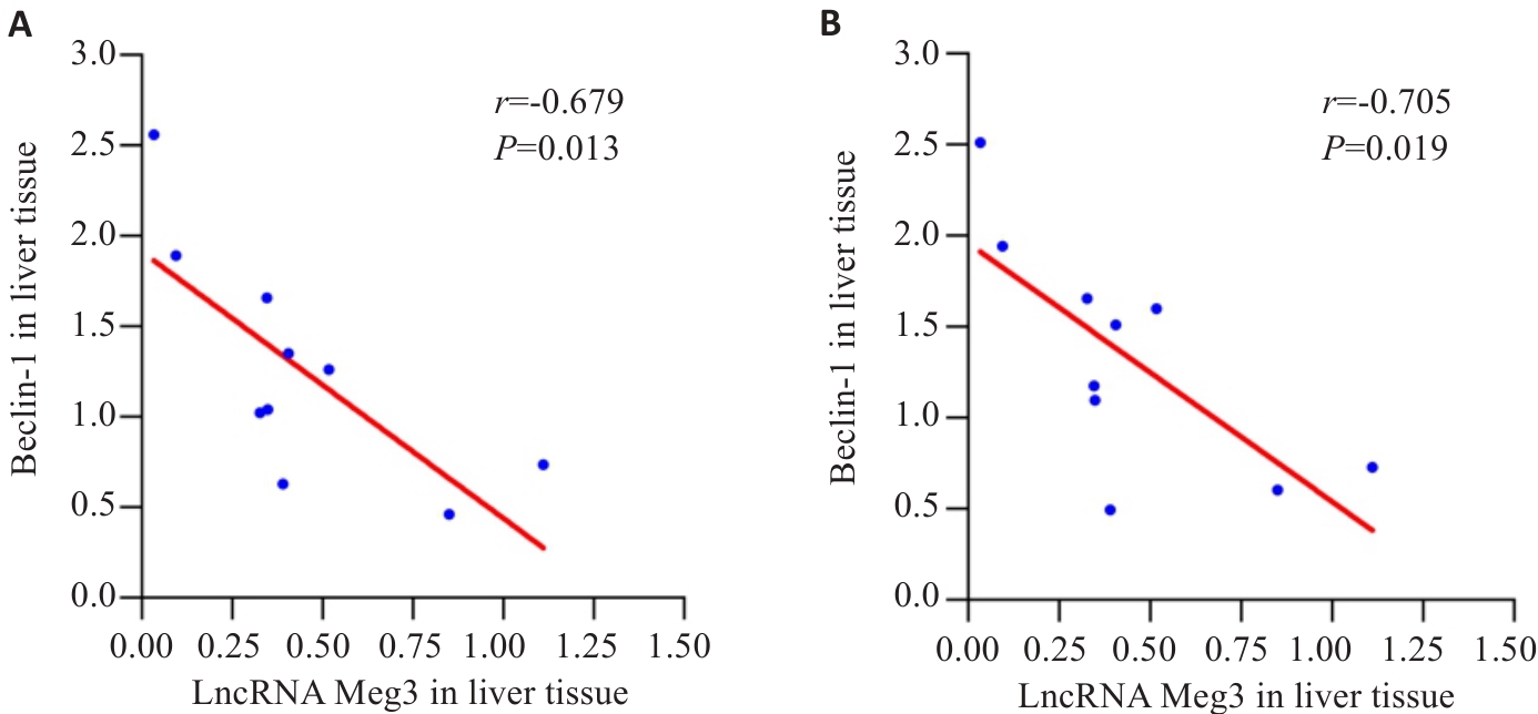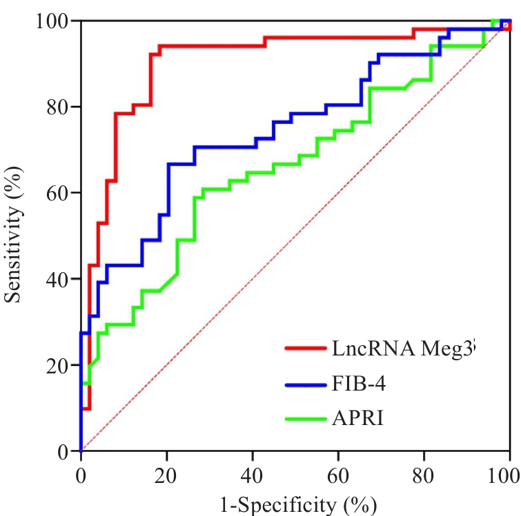 Objective To investigate the expression of the long non-coding RNA maternally expressed gene 3 (LncRNA Meg3) in patients with the Wilson disease (WD) and its correlation with the severity of liver fibrosis and autophagy-related markers. Methods A total of 100 WD patients and 50 healthy individuals were enrolled from the First Affiliated Hospital of Anhui University of Chinese Medicine. Serum biomarkers, including platelet count, hyaluronic acid (HA), laminin (LN), type III procollagen N-terminal peptide (PIIINP), type IV collagen (C‑IV), alanine aminotransferase (ALT), and aspartate aminotransferase (AST), were measured, and the non-invasive indices APRI and FIB-4 were calculated. Peripheral blood levels of LncRNA Meg3, Beclin-1 and LC3B were detected using RT-qPCR, and liver stiffness (LSM) and shear wave velocity (SWV) were evaluated using two-dimensional shear wave elastography (2D-SWE). The liver tissues from 10 WD patients and 10 patients with hepatic hemangioma were examined using histochemical staining, transmission electron microscopy, and RT-qPCR. Results The expression level of LncRNA Meg3 was significantly lower, while the levels of AST, ALT, HA, LN, PIIINP, C‑IV, APRI, FIB-4, LSM and SWV were significantly higher in WD patients than in the healthy individuals (all P<0.01). LncRNA Meg3 was negatively correlated with LSM, SWV, APRI, FIB-4, Beclin-1 and LC3B (P<0.05). ROC analysis demonstrated that LncRNA Meg3 effectively discriminated >F4 stage fibrosis (AUC=0.902) with a sensitivity of 92.9% and a specificity of 83.7% at the optimal cut-off value, outperforming APRI (AUC=0.746) and FIB-4 (AUC=0.661). The liver tissues from WD patients exhibited characteristic histopathological changes and lowered expression of LncRNA Meg3, which was negatively correlated with Beclin-1 and LC3B expressions (P<0.05). Liver fibrosis staging (7 S4 cases and 3 S3 cases) was significantly associated with LSM and SWV levels (P<0.05). Conclusion The expression level of LncRNA Meg3 is significantly decreased in WD patients, which is negatively correlated with the severity of liver fibrosis and closely related to the level of autophagy.