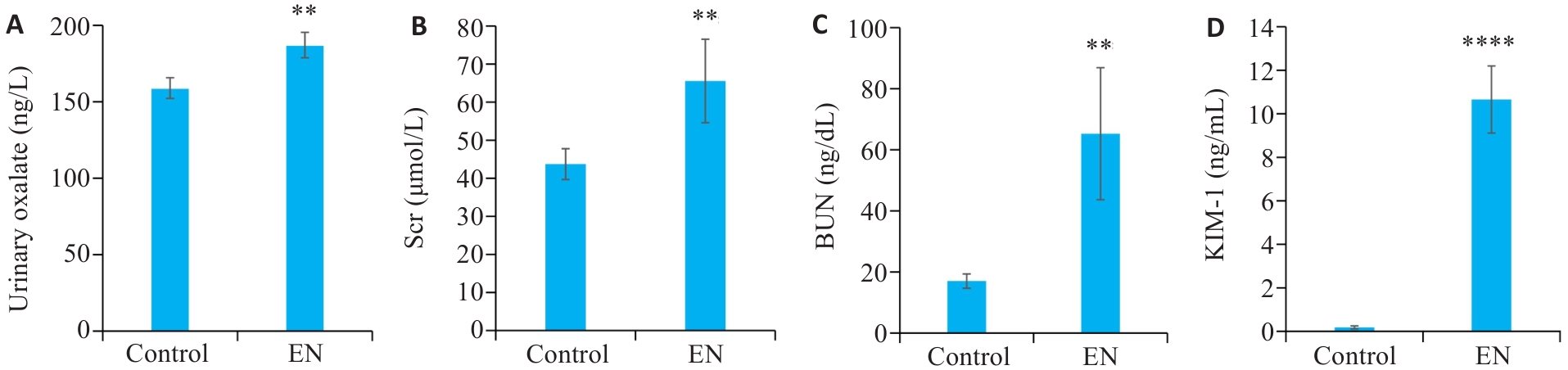 Fig.4 Changes in metabolism and renal-related indicators in the rat models of calcium oxalate kidney stone. A: Urinary oxalate. B: Serum creatinine. C: Blood urea nitrogen. D: Kidney injury molecule-1 (KIM-1). (Mean±SD, n=6). **P<0.01, ****P<0.0001 vs control group. EN: Model group.