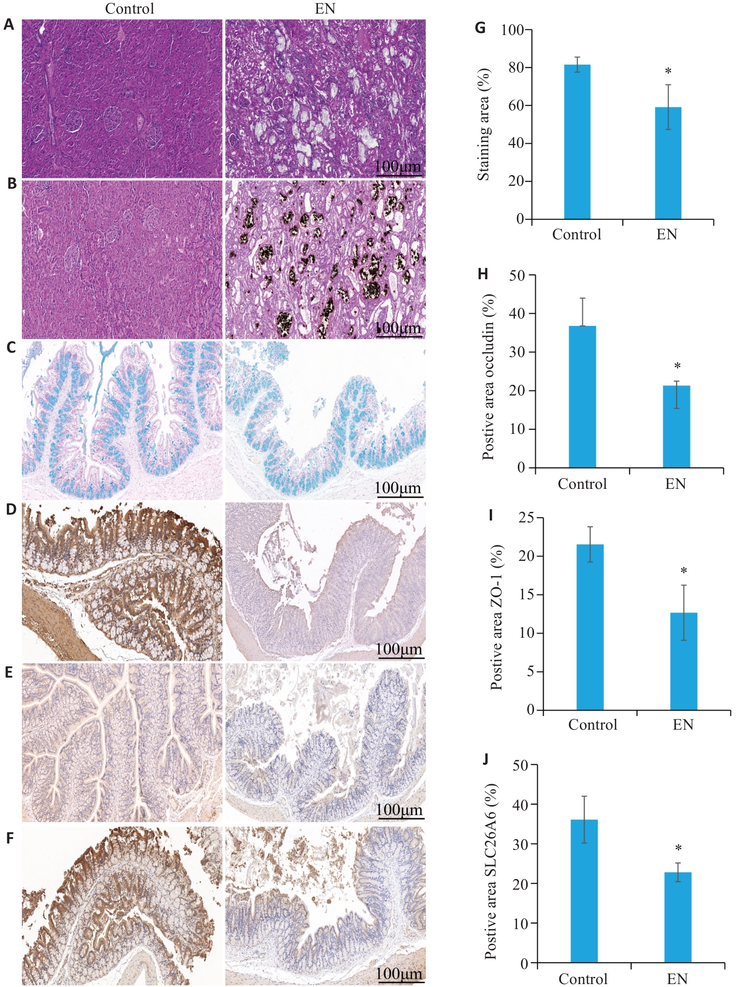 Fig.5 Changes in renal and intestinal tissue morphology in the rat modes of calcium oxalate kidney stone. A: HE staining. B: Von Kossa staining. C: Alcian blue staining of the intestine (scale bar=100 μm). D-F: Immunohistochemical staining showing changes in Occludin, ZO-1, and the oxalate transporter SLC26A6 in the intestine. G: Quantitative analysis of mucin by Alcian blue staining. H-J: Optical density (OD) values of Occludin, ZO-1, and SLC26A6 (Mean±SD, n=3). *P<0.05 vs control group.