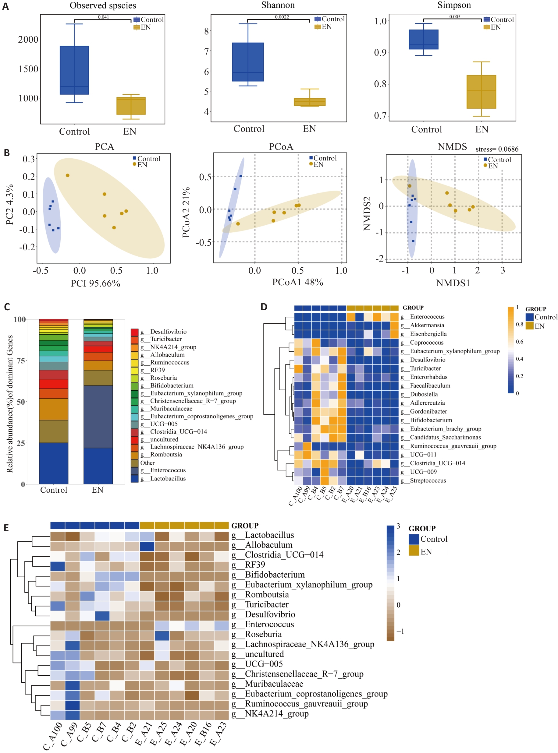 Fig.6 Changes in the composition of gut microbiota in the rat modes of calcium oxalate kidney stones. A: α-diversity assessed using Observed species, Shannon, and Simpson indices. B: β-diversity evaluated by PCA, PCoA, and NMDS analyses. C: Bar chart of bacterial community composition at the genus level. D: Heatmap of the differential genera identified by Wilcoxon rank-sum test. E: Heatmap analysis of the control and model groups at the genus level further illustrates that the relative abundance of bacterial taxa is positively correlated with color intensity.