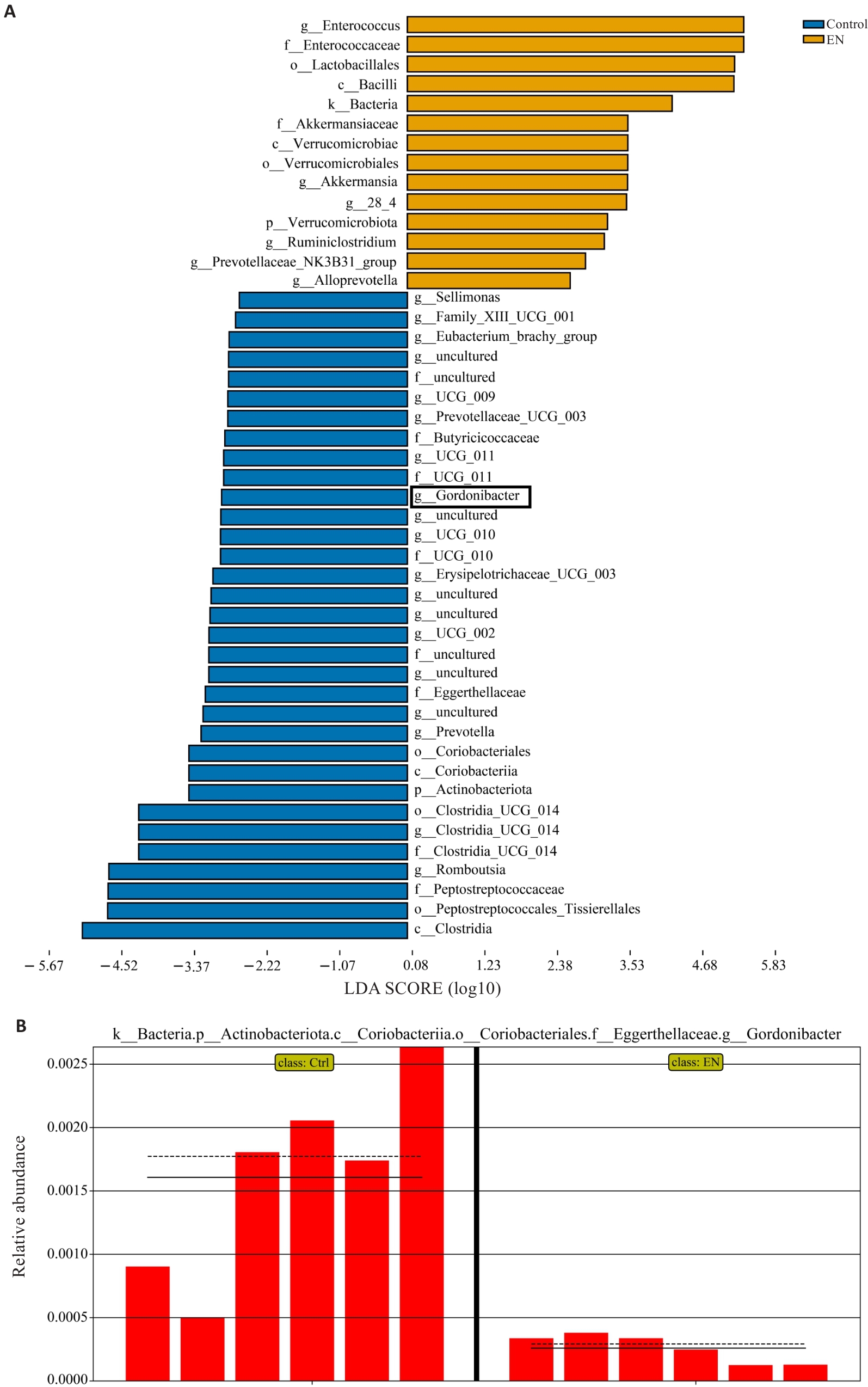 Fig.7 LEfSe analysis. A: Bar chart showing the major differential taxa between the control and model groups identified by LEfSe analysis. B: Bar chart of intergroup differences in Gordonibacter (the solid line represents the mean, and the dashed line represents the median).