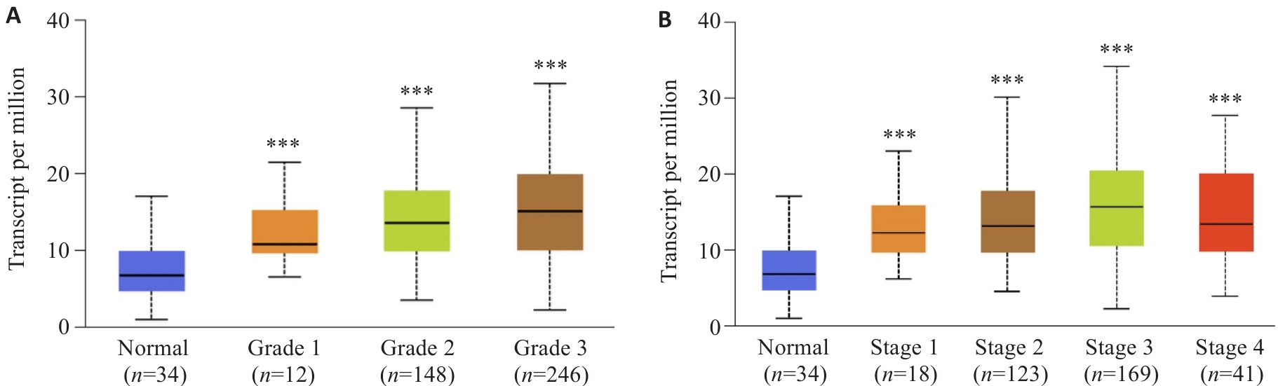 Fig.2 High YEATS2 expression is significantly associated with tumor grading and staging in gastric cancer patients. A: Correlation between YEATS2 TPM and tumor grading in gastric cancer. B: Correlation between YEATS2 TPM and tumor staging in gastric cancer. ***P<0.001 vs adjacent tissue.