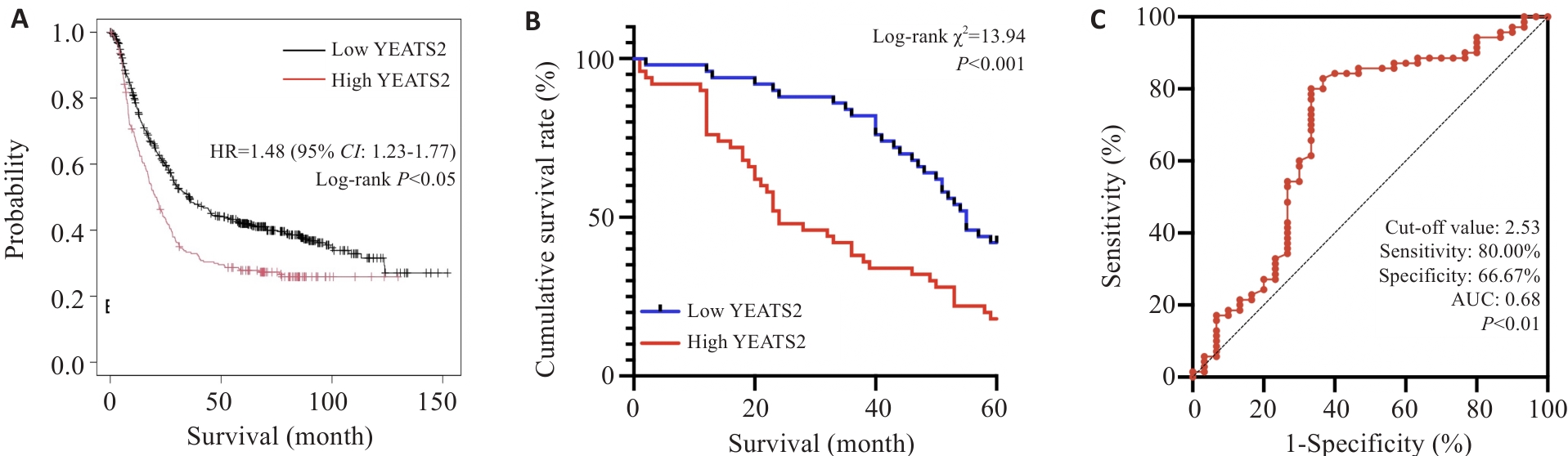 Fig.3 Effect of YEATS2 on prognosis of patients with gastric cancer. A: Kaplan-Meier analysis. B: Survival curves. C: Predictive value of YEATS2 for 5-year survival after radical gastrectomy.