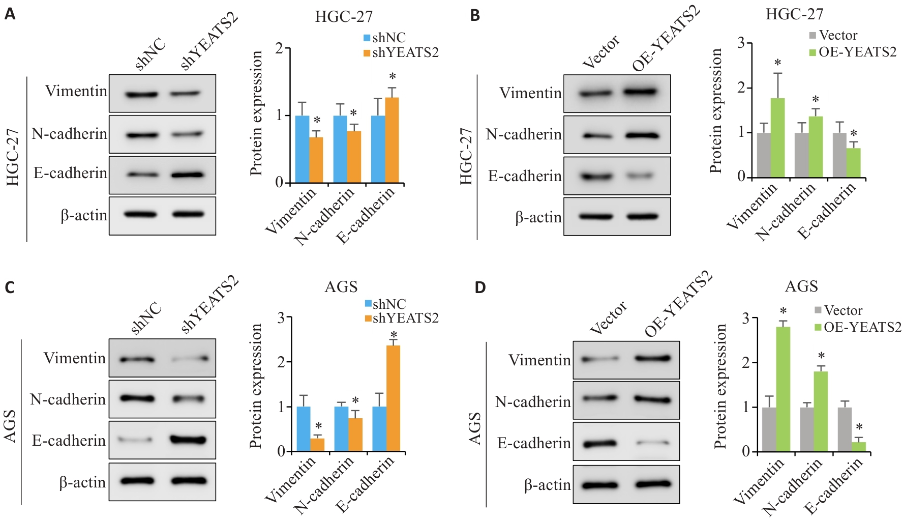 Fig.7 YEATS2 promotes EMT process in gastric cancer cells. A, B : Expressions of key EMT-related proteins in HGC27 cells. C, D: Expressions of key EMT-related proteins in AGS cells. n=3, *P<0.05 vs shNC or vs Vector.
