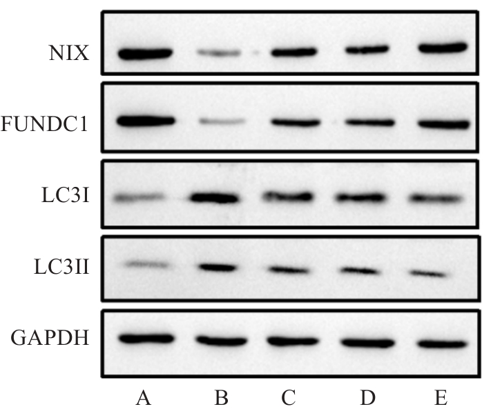 Fig.1 Effect of Qingre Lidan Jiedu Recipe on protein expression of NIX, FUNDC1, LC3I, and LC3II in the hippocampus of the rats in each group. A: NG group; B: MG group; C: TCM group; D: PCA group; E: TCM+PCA group.