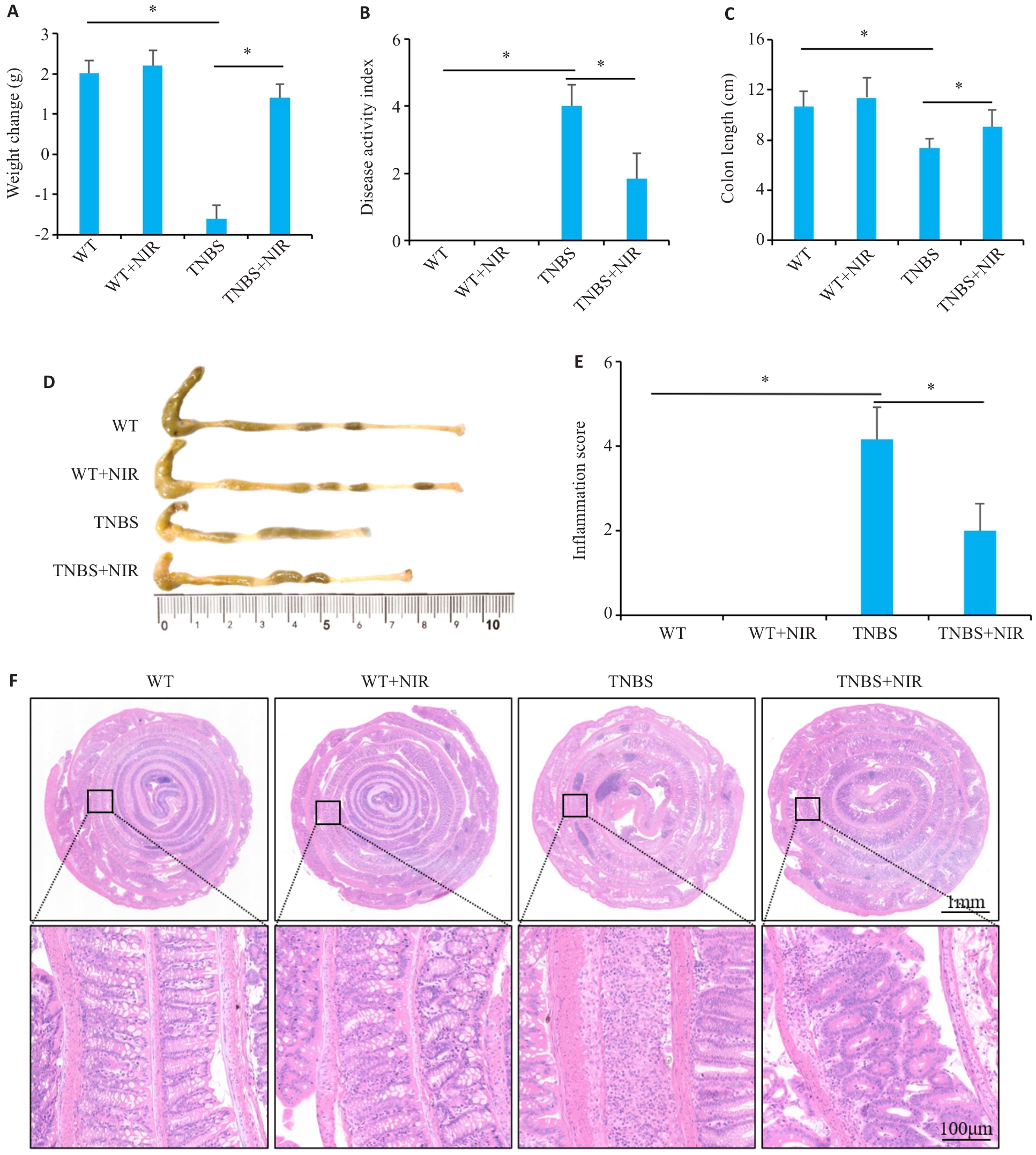 Fig.1 Effect of niranthin (NIR) treatment on symptoms of TNBS-induced colitis in mice. A: Body weight changes of the mice. B: DAI score. C: Colon length. D: Comparison of colon length of the mice among the 4 groups. E: Colon inflammation score of the mice. F: HE staining of the colon tissues of the mice in the 4 groups.*P<0.05.