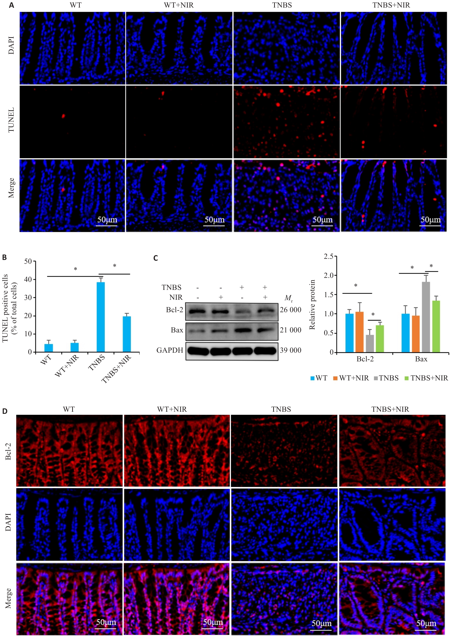Fig.3 Effect of NIR treatment on TNBS-induced apoptosis of intestinal epithelial cells in the mouse models of colitis. A, B: TUNEL staining for detecting apoptosis in TNBS-induced mice with NIR treatment. C: Western blotting for detecting the expression of Bcl-2 and Bax proteins in TNBS-induced mice with NIR treatment. D: Immunofluorescence staining for detecting Bcl-2 expression in TNBS-induced mice with NIR treatment. *P<0.05.