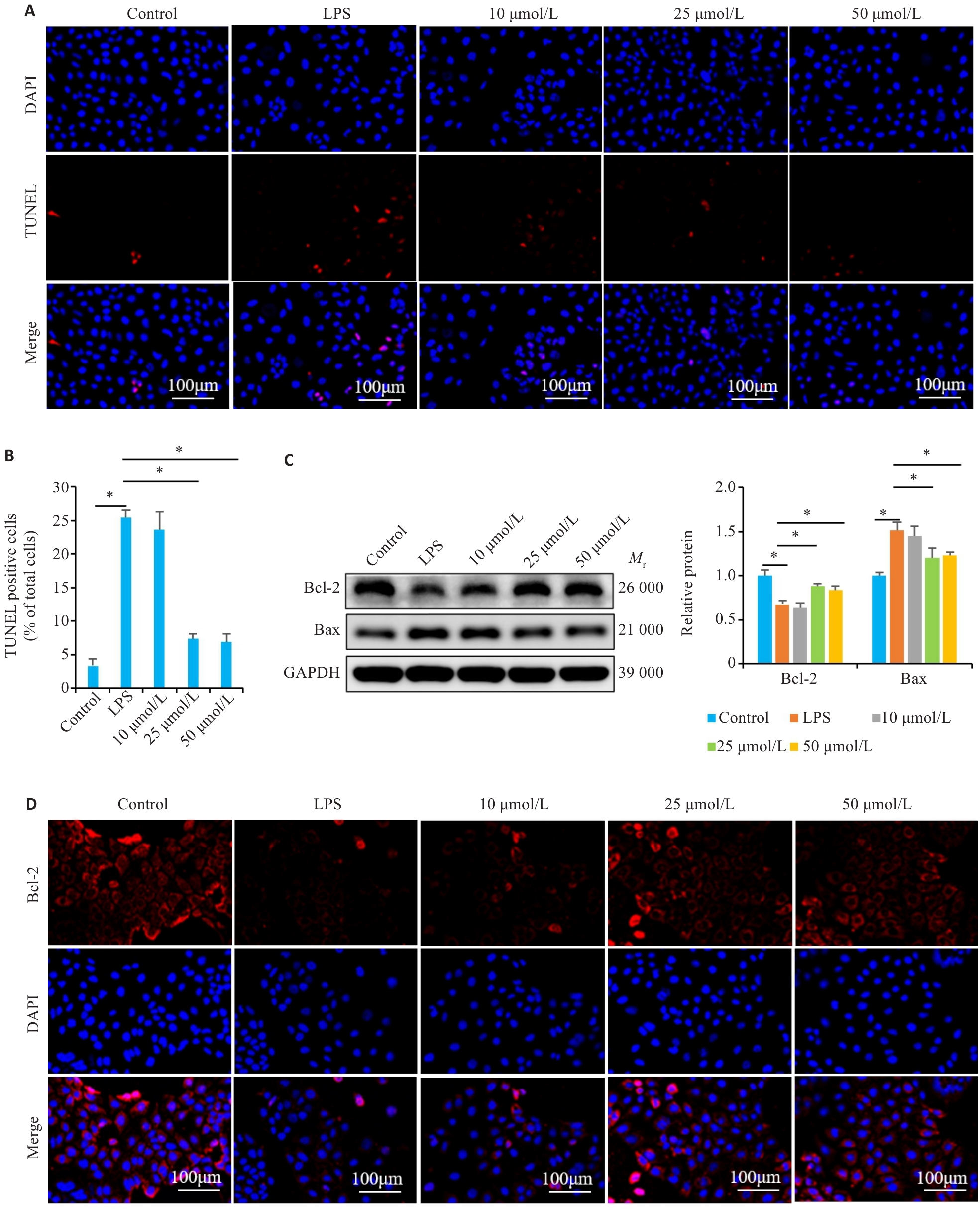 Fig.5 Effect of NIR treatment on LPS-induced apoptosis in Caco-2 cells. A, B: TUNEL staining for detecting LPS-induced apoptosis of Caco-2 cells with NIR treatment. C: Western blotting for detecting the expression of Bcl-2 and Bax proteins in LPS-induced Caco-2 cells with NIR treatment. D: Immunofluorescence staining for detecting Bcl-2 expression in LPS-induced Caco-2 cells with NIR treatment. *P<0.05.