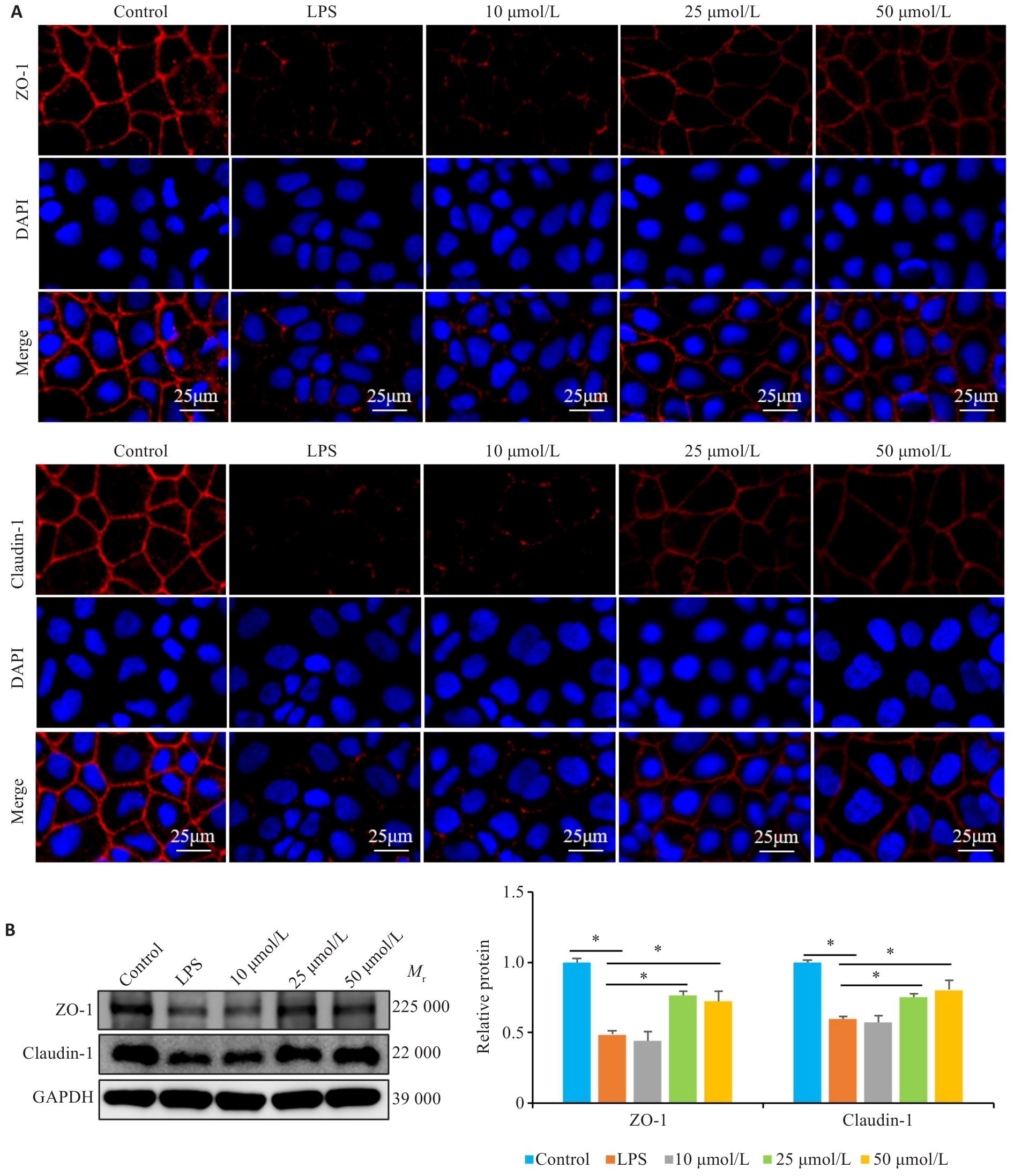 Fig. 6 Effect of NIR treatment on expressions of tight junction proteins in LPS-induced Caco-2 cells. A: Immunofluorescence staining showing ZO-1 and claudin-1 expressions in LPS-induced Caco-2 cells with NIR treatment. B: Western blotting for detecting ZO-1 and claudin-1 protein expressions in LPS-induced Caco-2 cells with NIR treatment. *P<0.05.