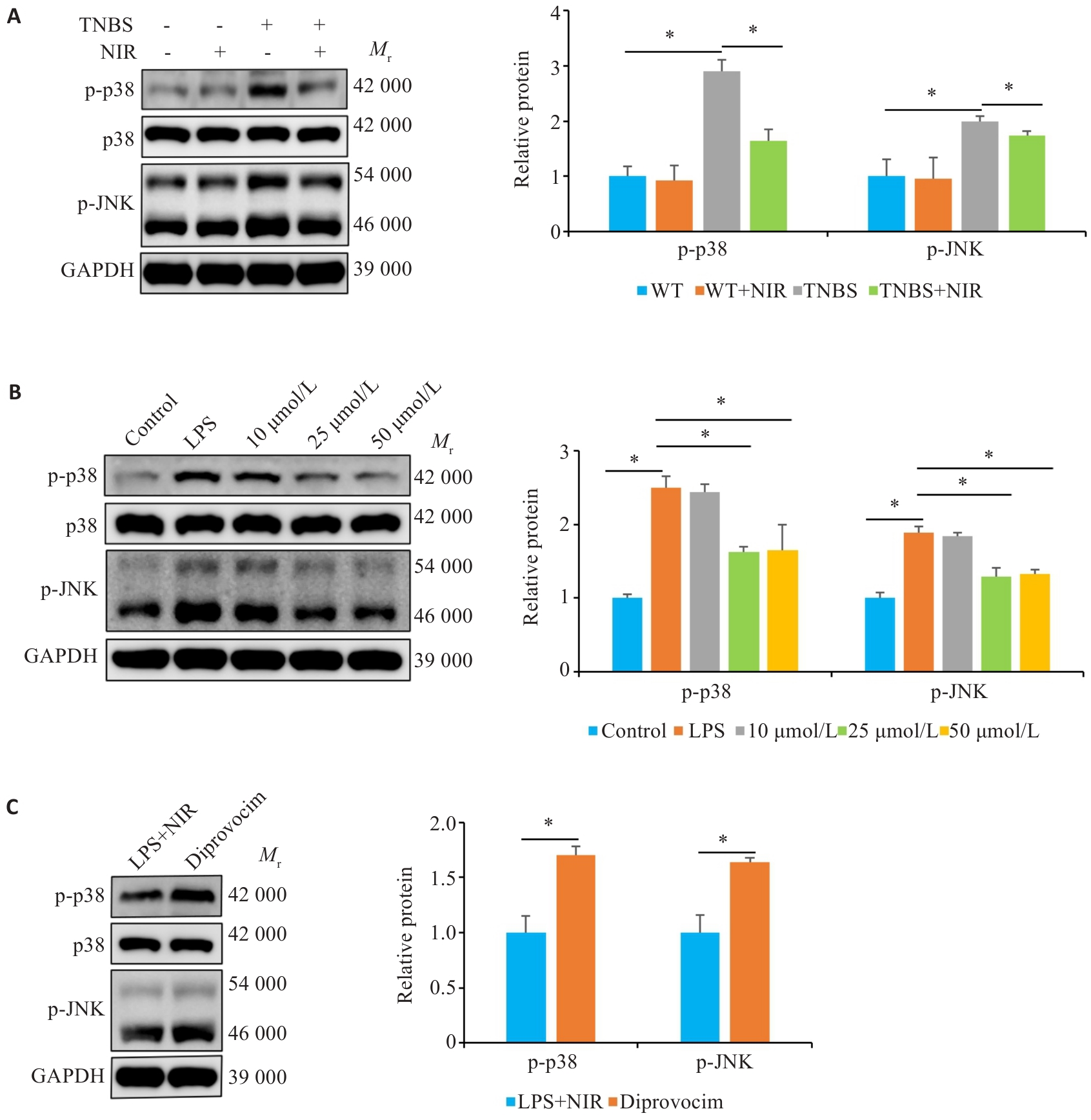 Fig. 7 NIR treatment modulates p38/JNK signaling. A: Western blotting for detecting p-p38 and p-JNK protein expressions in TNBS-induced mice with NIR treatment. B: Western blotting for detecting p-p38 and p-JNK protein expressions in LPS-induced Caco-2 cells with NIR treatment. C: Western blotting for detecting p-p38 and p-JNK protein expressions in the colon tissues of the mice with NIR and diprovocim treatment. *P<0.05.