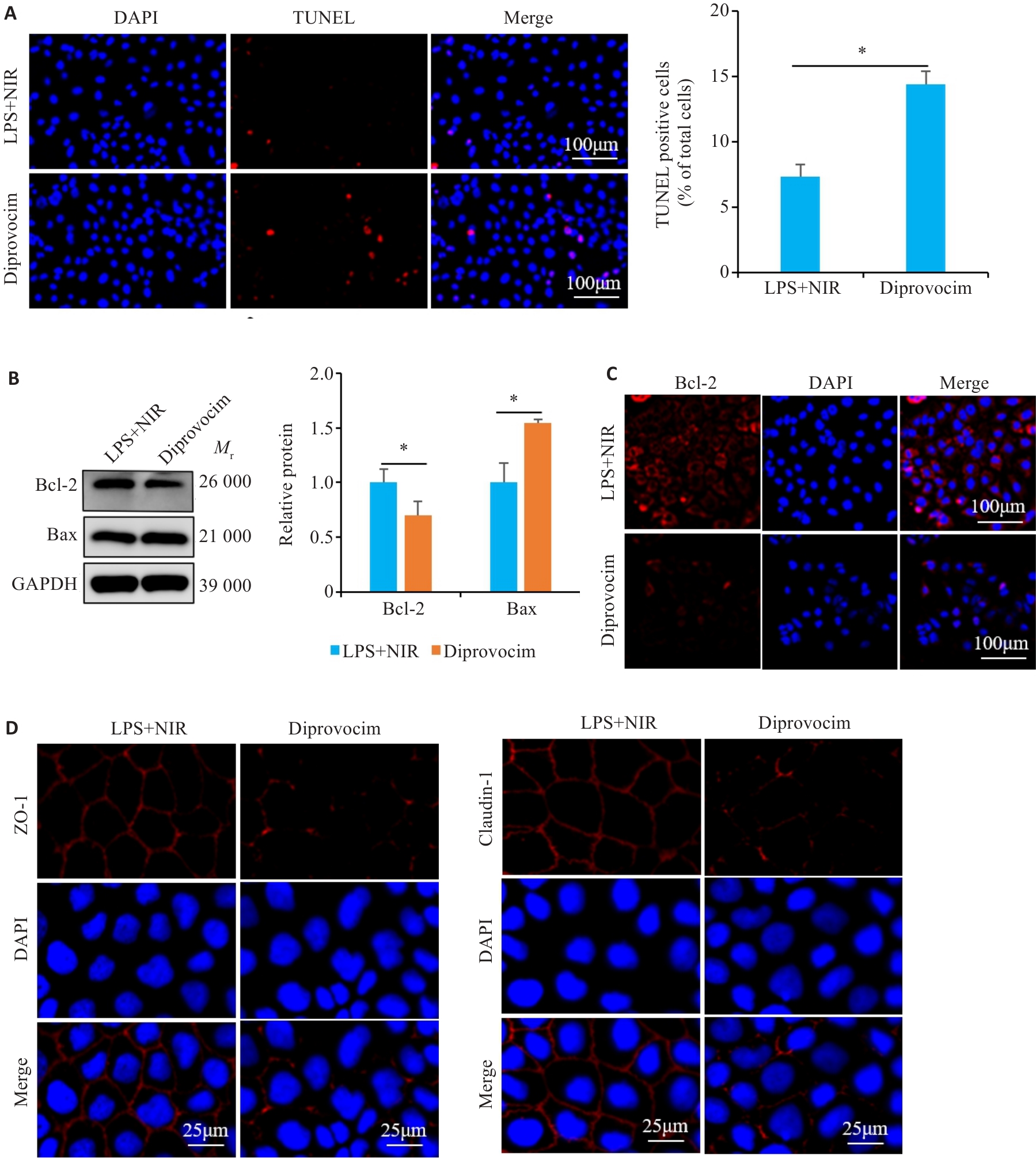 Fig. 8 Effects of diprovocim intervention on apoptosis and expressions of tight junction proteins in NIR-treated Caco-2 cells. A: TUNEL staining for detecting apoptosis in NIR-treated Caco-2 cells by Diprovocim treatment. B: Western blotting for detecting the expression of Bcl-2 and Bax proteins in NIR-treated Caco-2 cells with diprovocim treatment. C, D: Immunofluorescence staining for detecting Bcl-2, ZO-1 and Claudin-1 expression in NIR-treated Caco-2 cells with diprovocim treatment. *P<0.05.