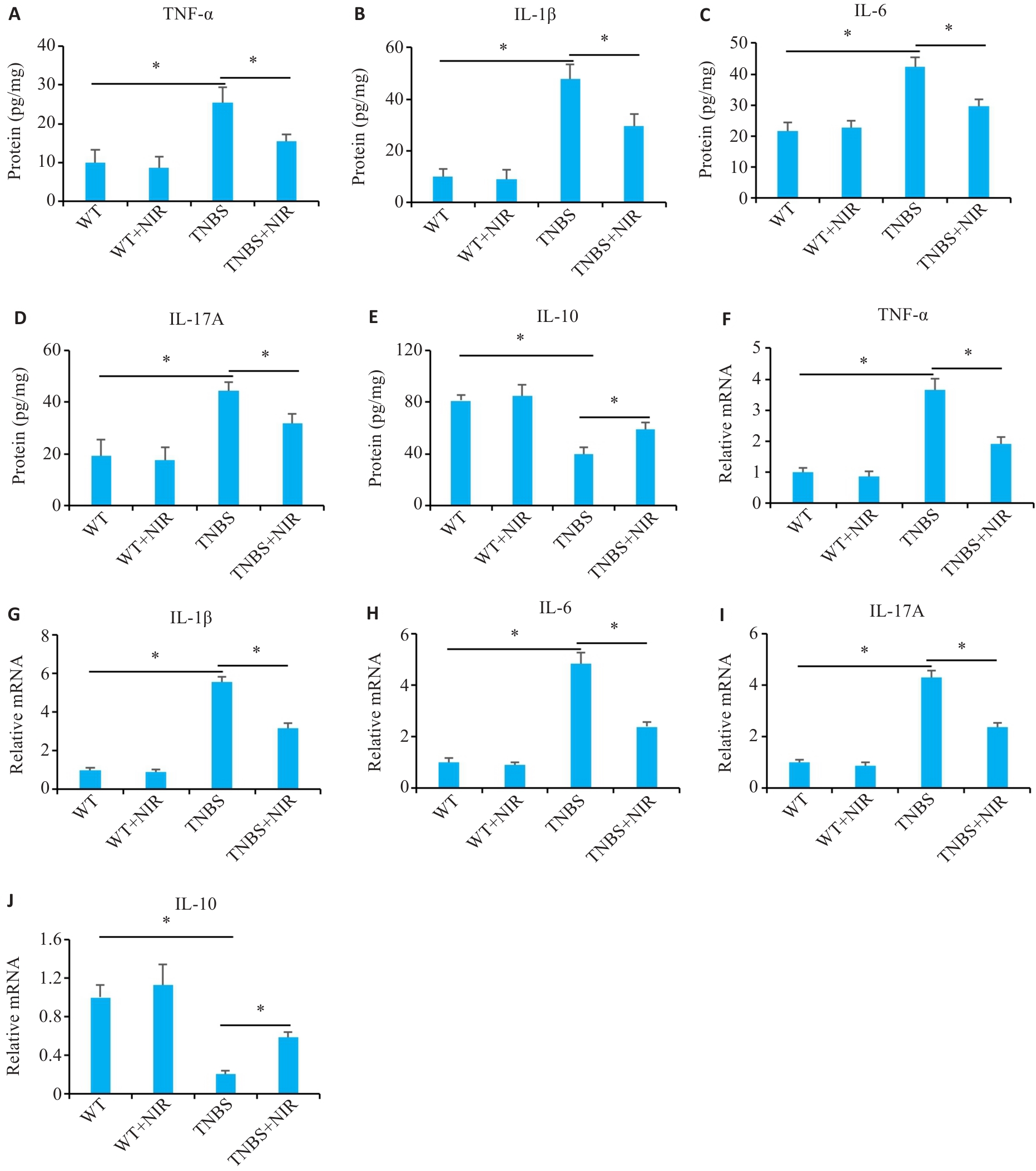 Fig.2 Effect of NIR treatment on inflammatory factor levels in mice with TNBS-induced colitis. A-E: Results of ELISA for detecting the levels of IL-6, IL-1β, IL-17A, TNF-α and IL-10 in the colon tissue of TNBS-induced mice. F-J: qRT-PCR for detecting IL-6, IL-1β, IL-17A, TNF‑α and IL-10 mRNA expressions in the colon tissues of TNBS-induced mice. *P<0.05.