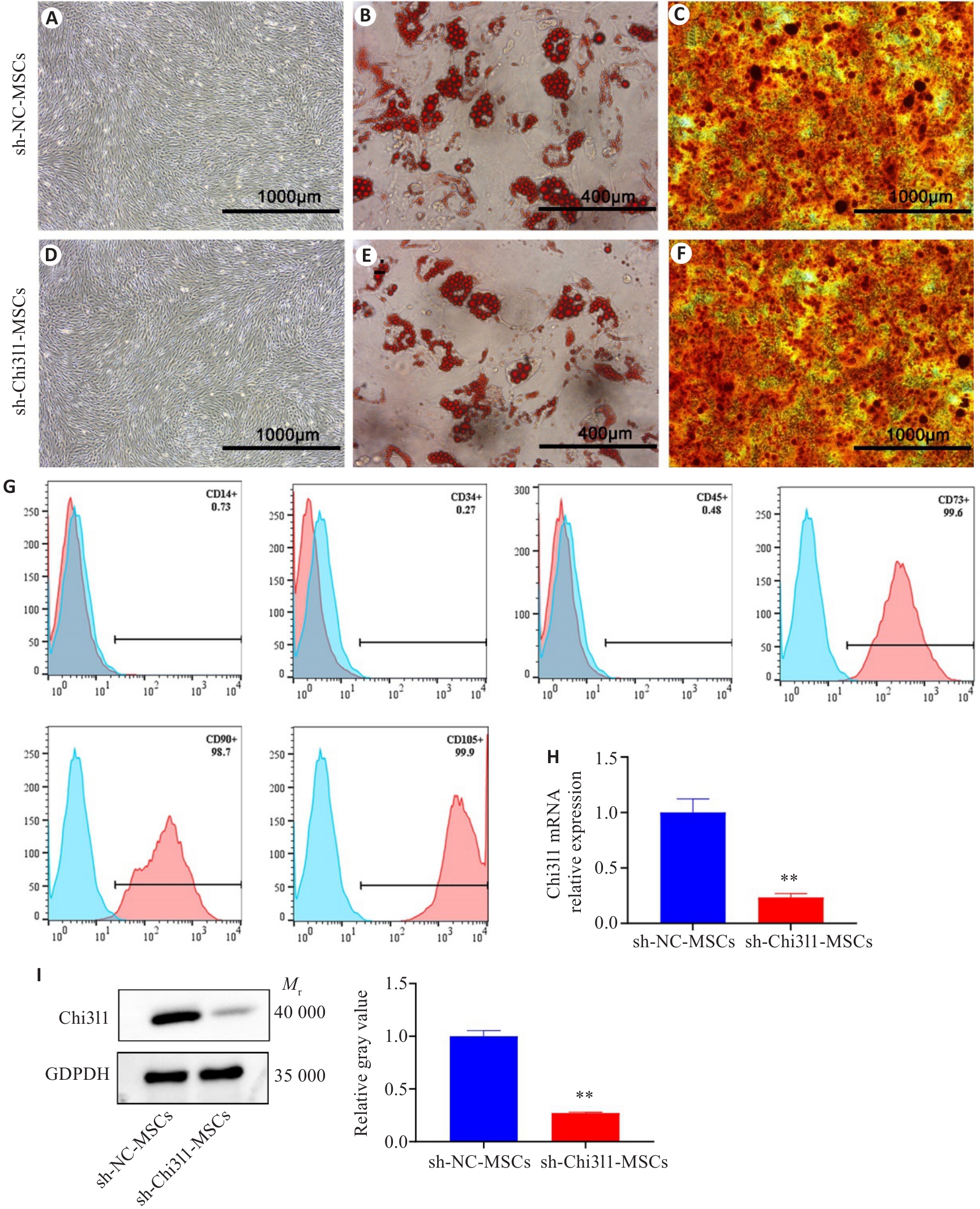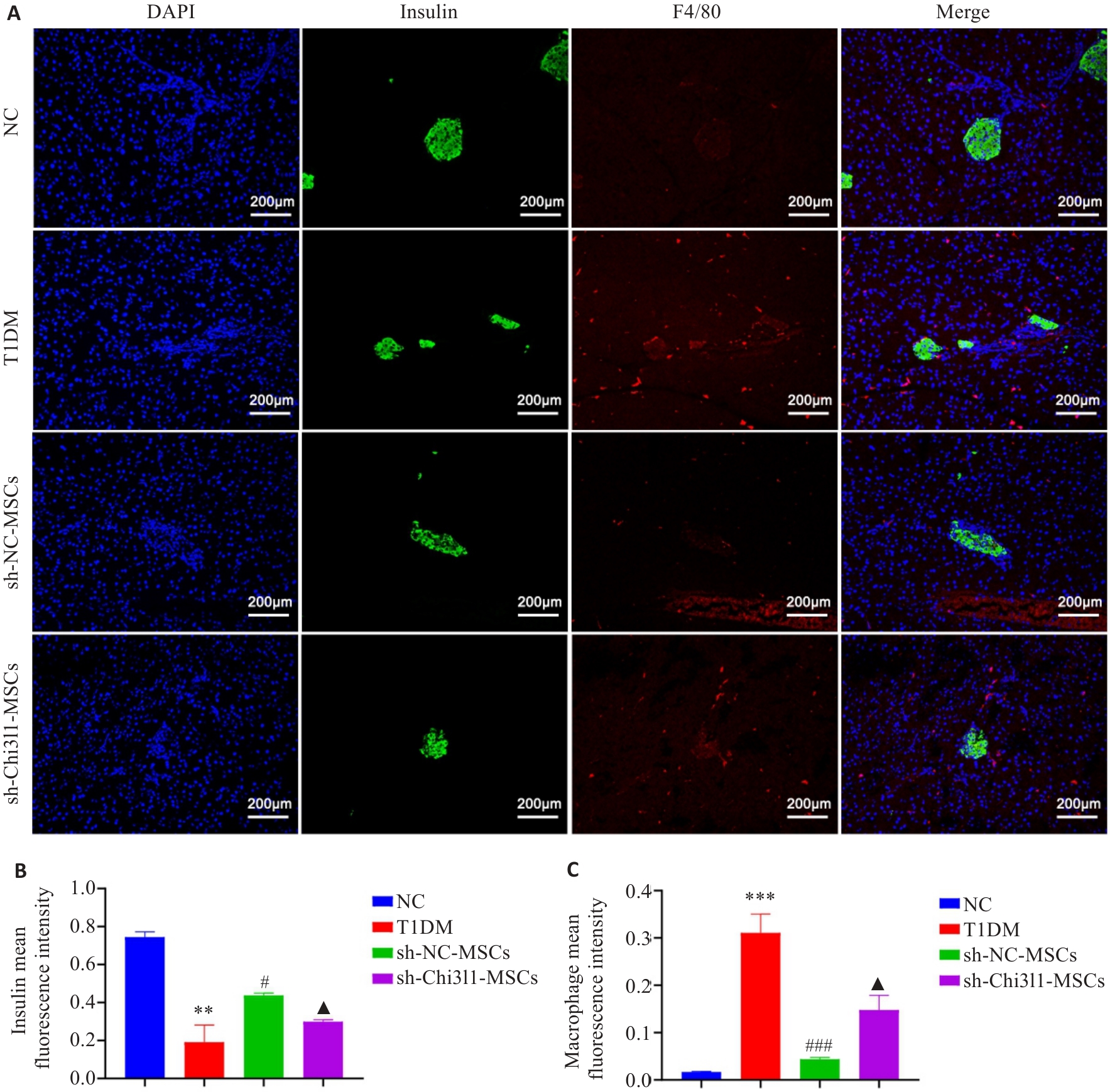 Objective To explore the role of Chi3l1 in human umbilical cord mesenchymal stem cell (hUC-MSCs) therapy of type 1 diabetes. Methods hUC-MSCs with stable Chi3l1 knockdown (sh-Chi3l1-MSCs) were constructed using a lentiviral vector and characterized by flow cytometry and adipogenic and osteogenic induction. In adult C57BL/6J mouse models of streptozotocin-induced T1DM, the therapeutic effects of sh-NC-MSCs and sh-Chi3l1-MSCs grafting were evaluated by observing changes in clinical manifestations, blood glucose, body weight and pancreatic tissue pathologies. Insulin content and macrophage infiltration in the islets were detected using immunohistochemistry and immunofluorescence staining. The effects of these two stem cells on induced polarization of co-cultured mouse bone marrow macrophages were assessed using flow cytometry by detecting the mRNA expressions of iNOS, Arg-1, TNF-α, IL-6, IL-10, IL-13, and IL-1β using qPCR. Results The constructed sh-Chi3l1-MSCs retained the characteristics of MSCs but showed reduced therapeutic efficacy in T1DM mice. Immunofluorescence staining showed that the number of macrophages in the pancreatic tissue of the mice treated with sh-Chi3l1-MSCs was higher than that in MSCs treatment group. In the co-culture experiments, sh-Chi3l1-MSCs exhibited a lowered capacity to suppress M1 polarization of the macrophages and a reduced efficacy to promote differentiation of M2-type macrophage subset. Analysis with qPCR showed that the expressions of M1 macrophage marker iNOS and the inflammatory factors TNF-α, IL-6, and IL-1β increased, while the expressions of M2 macrophage marker Arg-1 and the cytokines IL-13 and IL-10 were decreased significantly in sh-Chi3l1-MSCs group. Conclusion In T1DM mouse models, hUC-MSCs mitigate inflammatory responses by suppressing the production of pro-inflammatory M1-type macrophages via Chi3l1.
